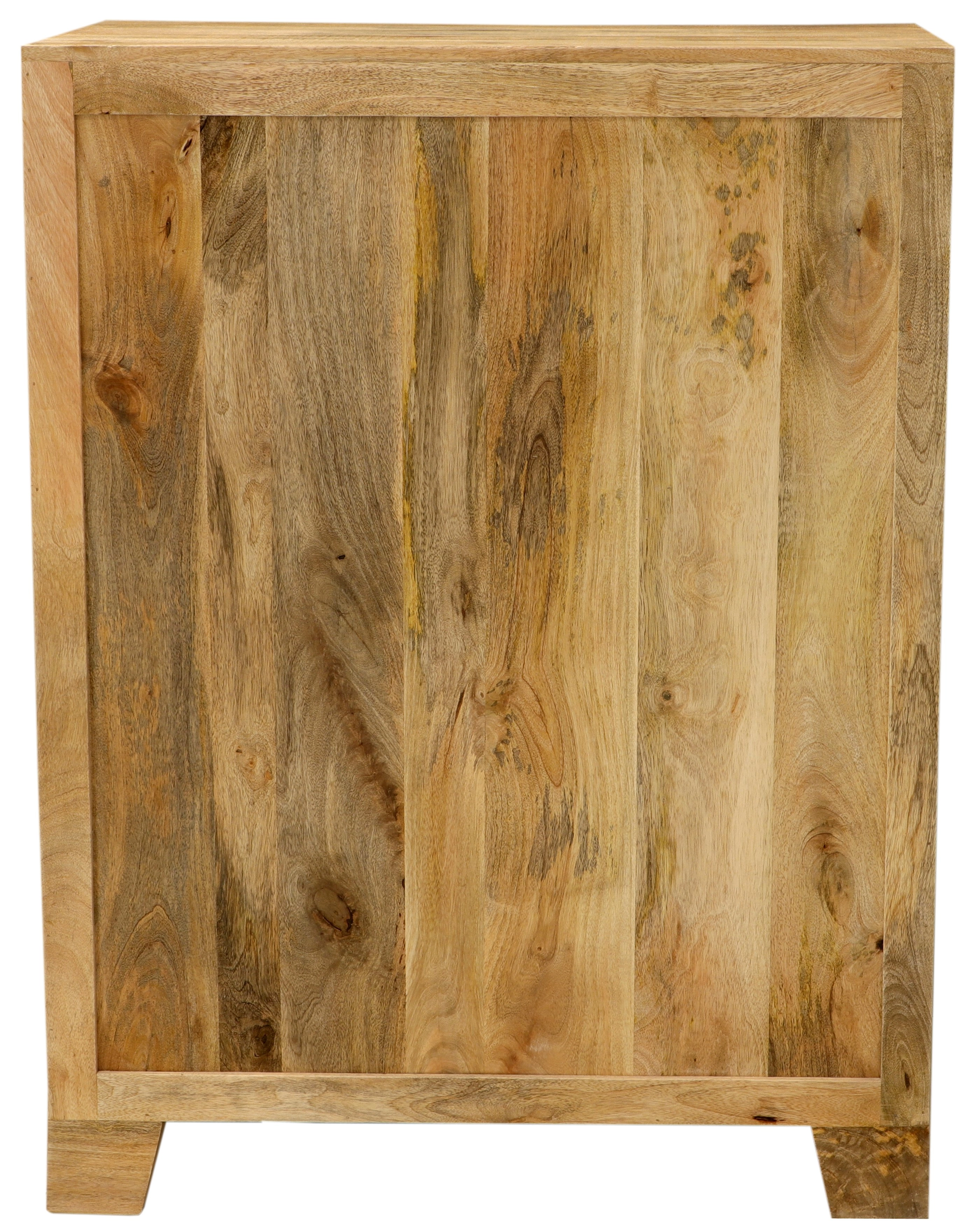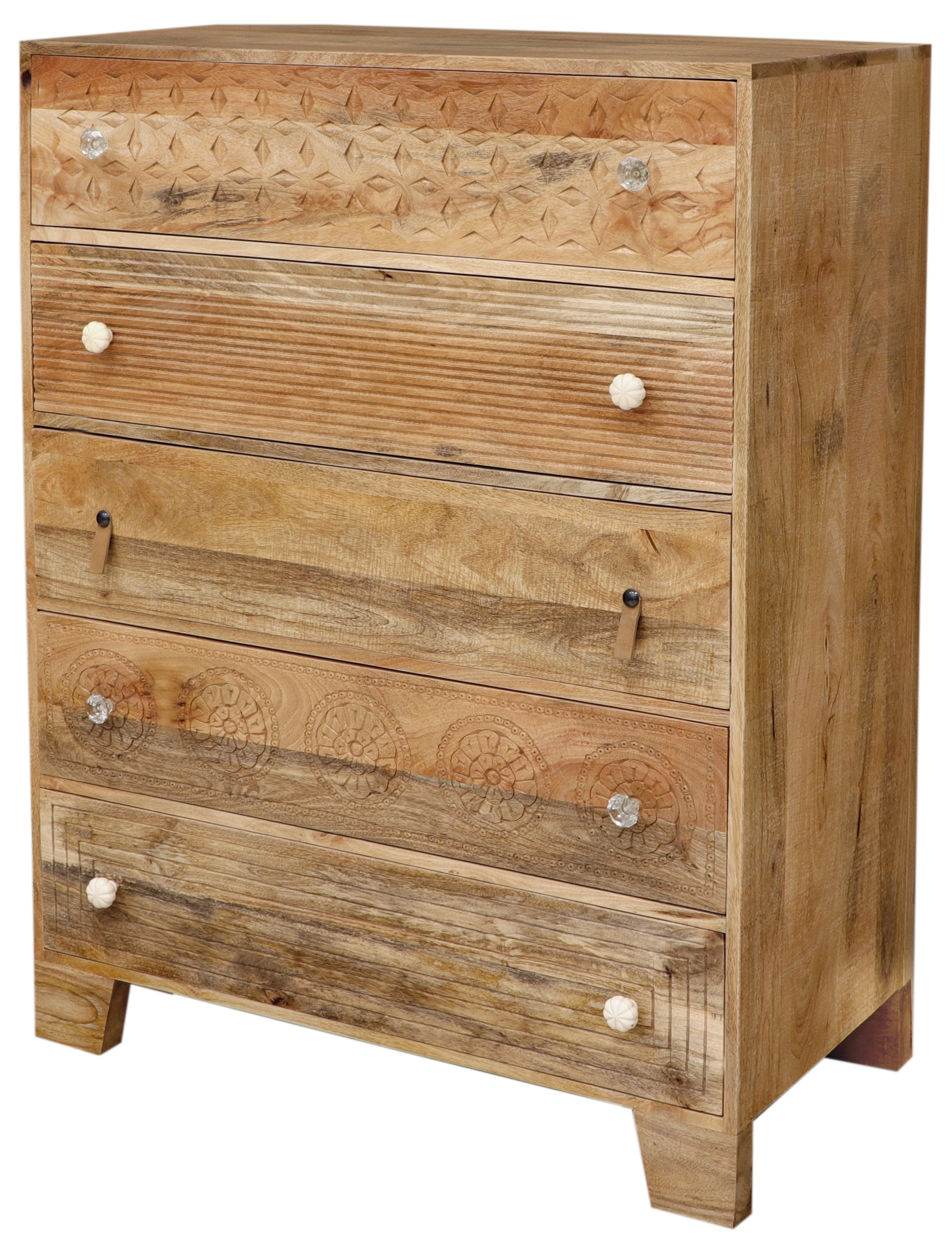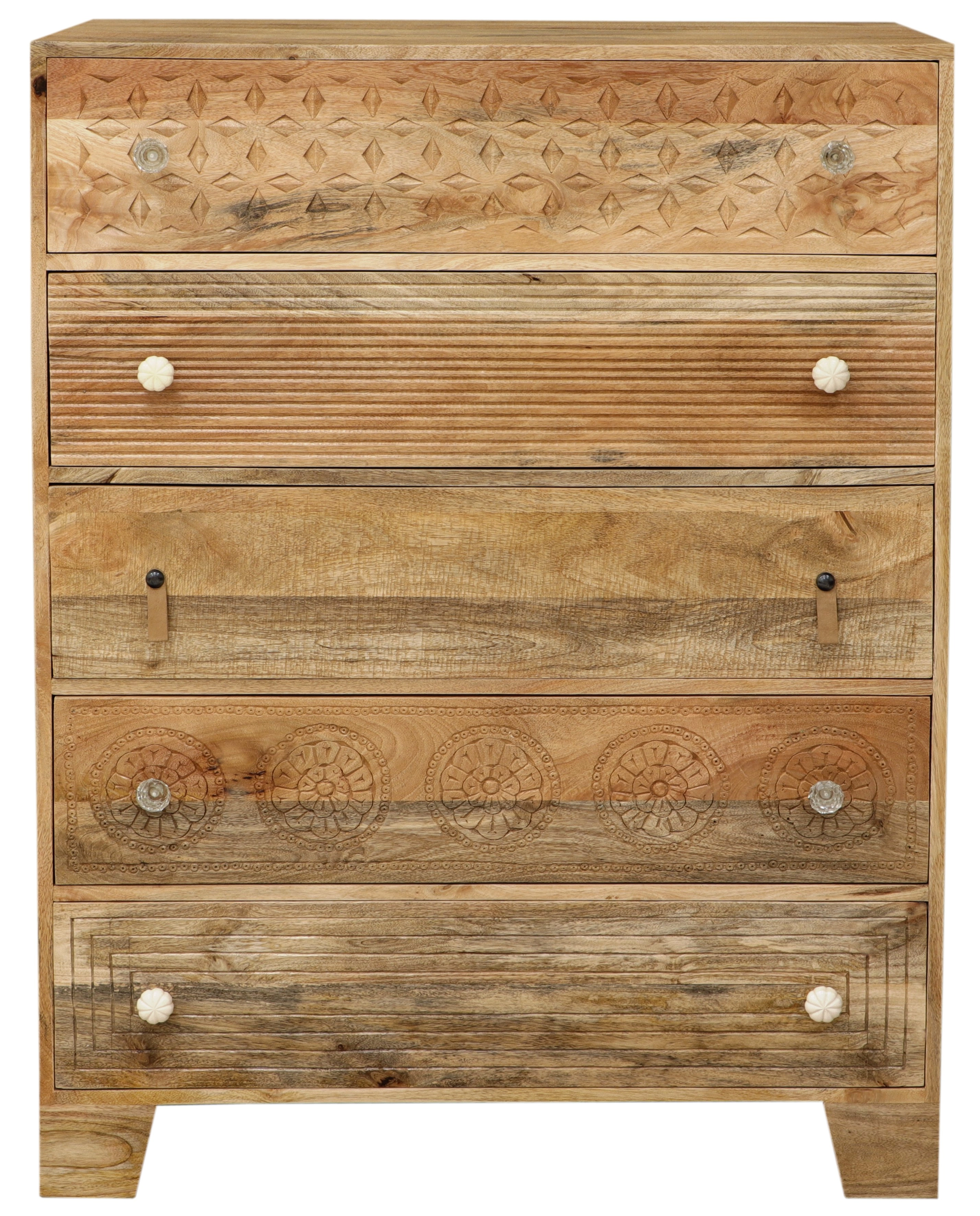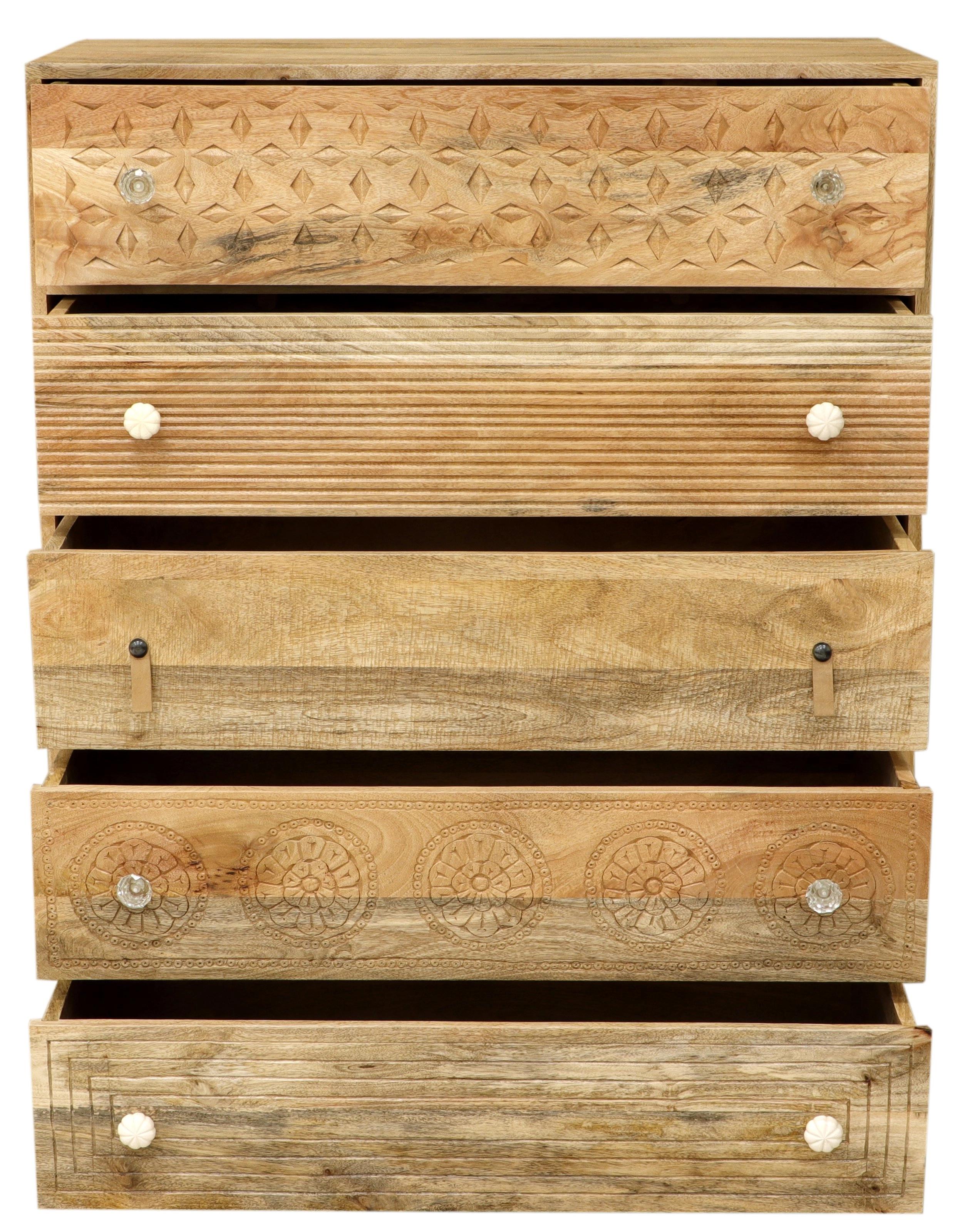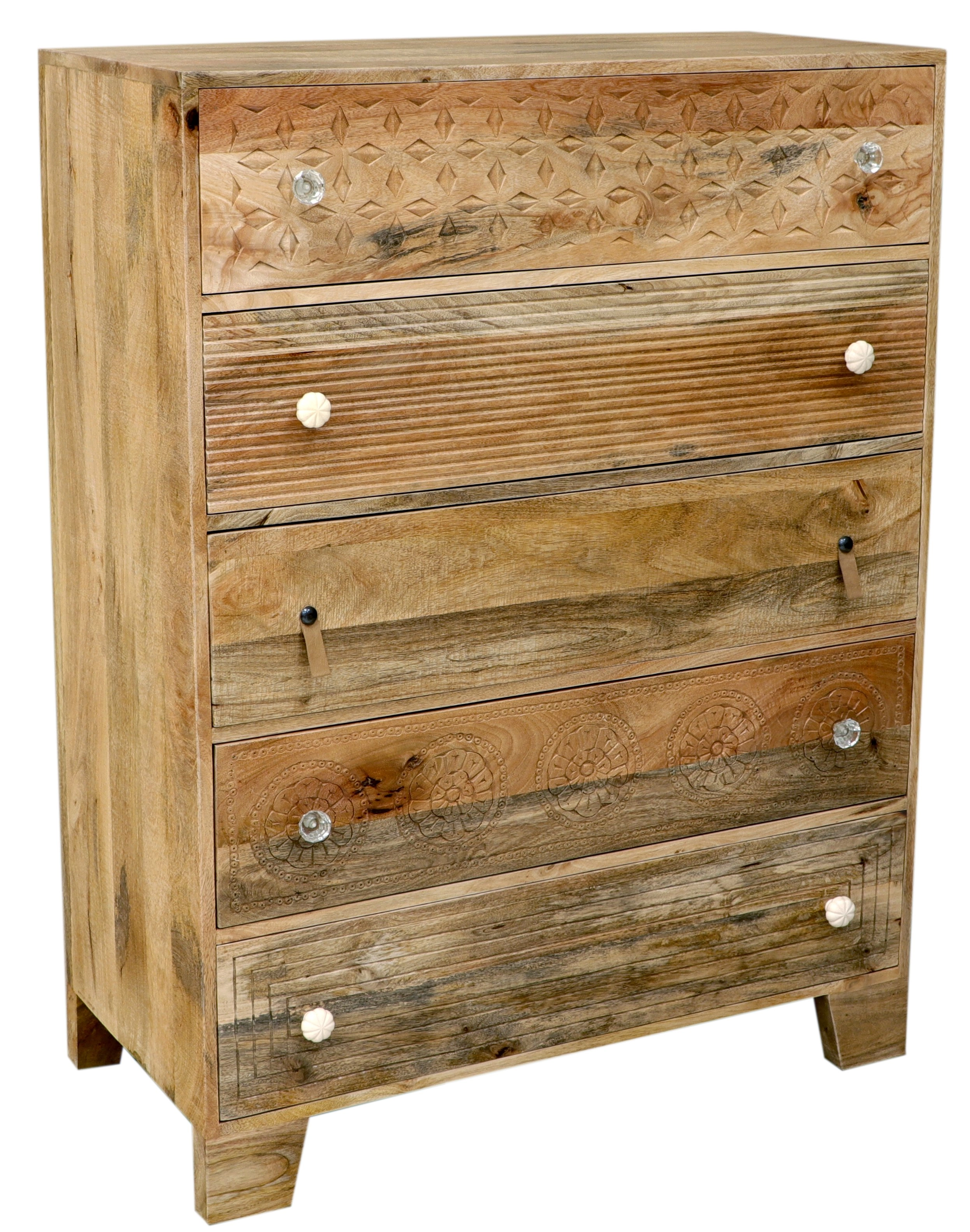 Tato rustikální komoda z mangového dřeva je jedinečným kouskem nábytku, který dodá vaší ložnici osobitý šarm. S rozměry 90 cm na šířku, 45 cm na hloubku a 120 cm na výšku nabízí dostatek úložného prostoru pro vaše osobní věci. Rustikální komody z masivního dřeva jsou dnes velmi vyhledávané díky své robustní konstrukci a nadčasovému stylu. Pět prostorných zásuvek vám umožní uspořádat vaše oblečení, doplňky nebo jiné osobní věci způsobem, který vám nejlépe vyhovuje. Vyrobená z kvalitního mangového dřeva pocházejícího z Indie, tato rustikální komoda přináší do vašeho domova exotickou atmosféru.