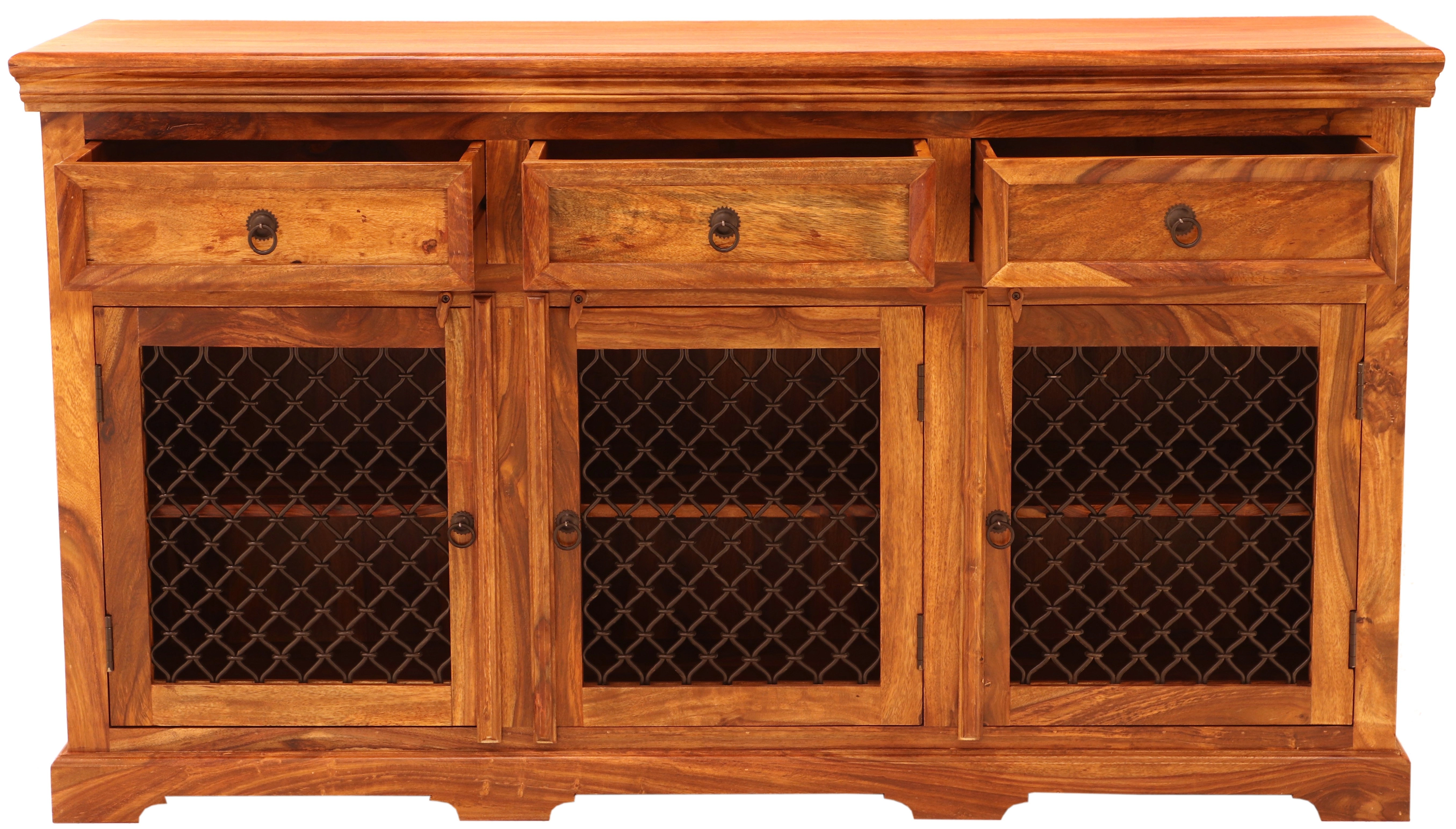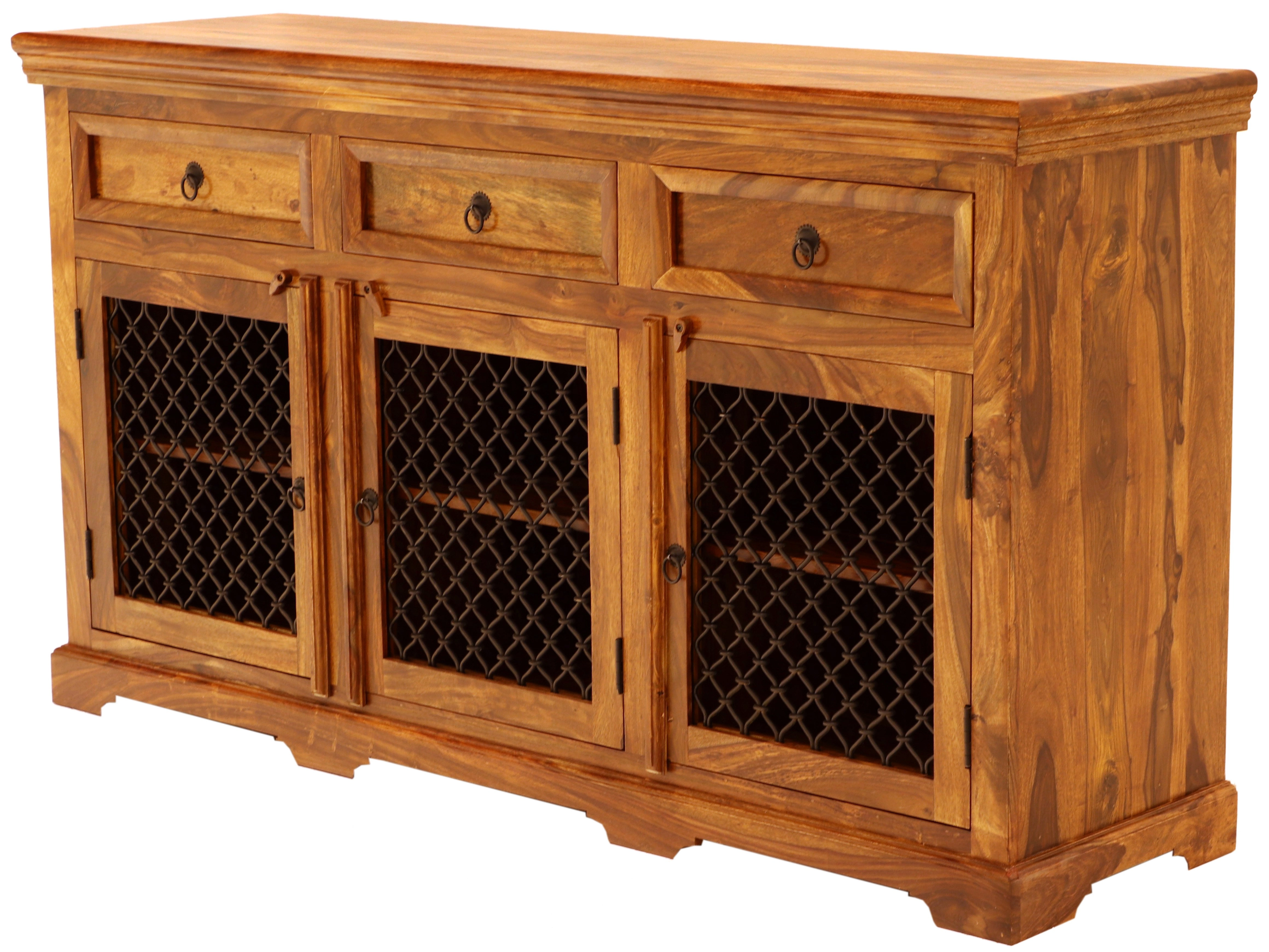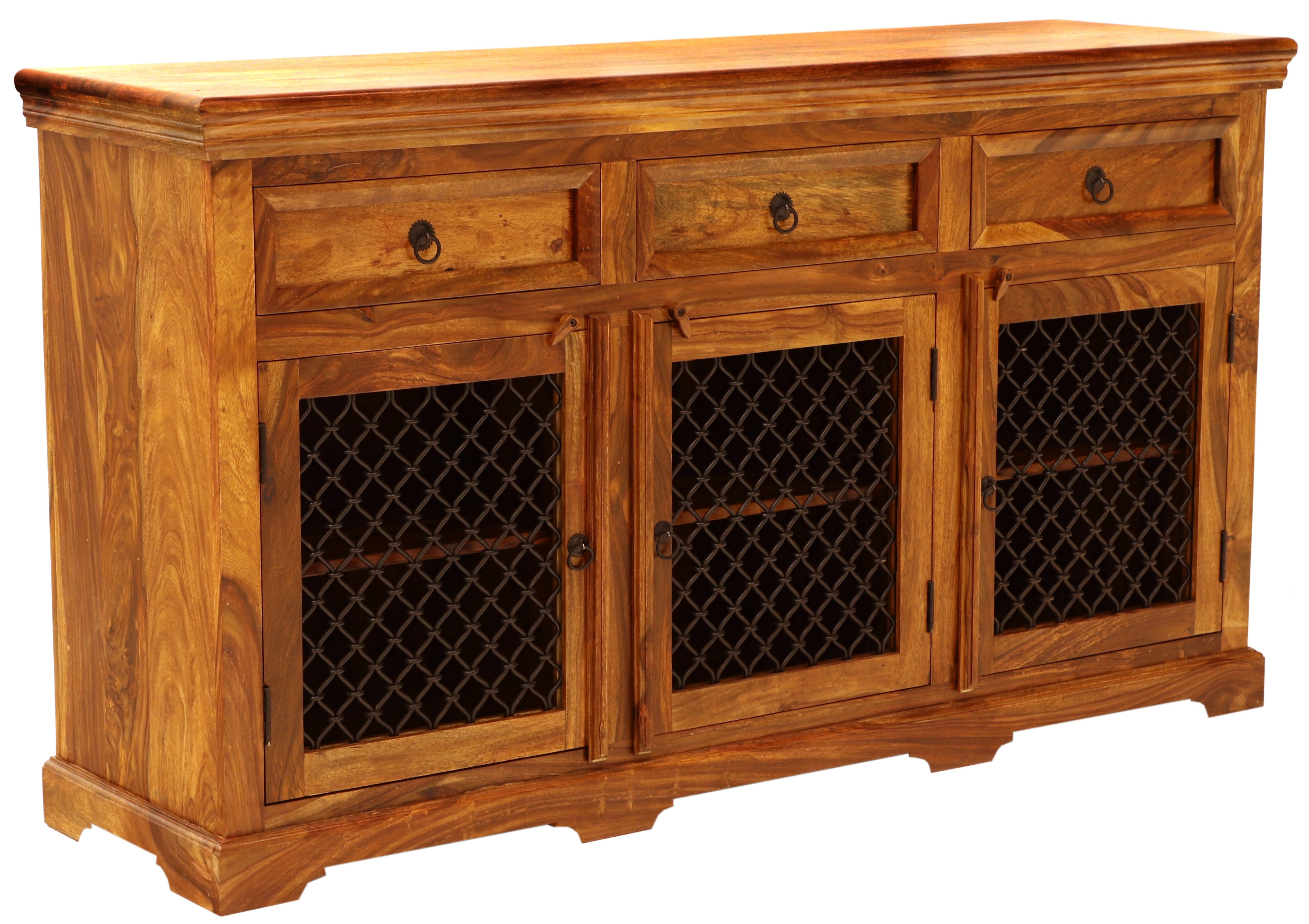 Tato komoda obsahuje tři zásuvky v horní části a troje spodní dvířka s kovovými úchyty a výpletem, které dodávají moderní šmrnc celkovému designu. Je to ideální řešení pro uložení oblečení, domácích potřeb nebo jiných předmětů, které potřebujete mít po ruce. Rustikální komoda se tak stává nejen praktickým kusem nábytku, ale také stylovým doplňkem, který přináší atmosféru daleké Indie do vašeho domova.