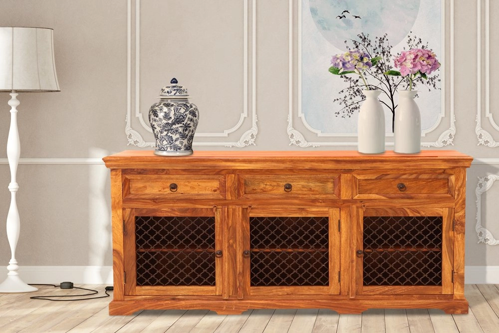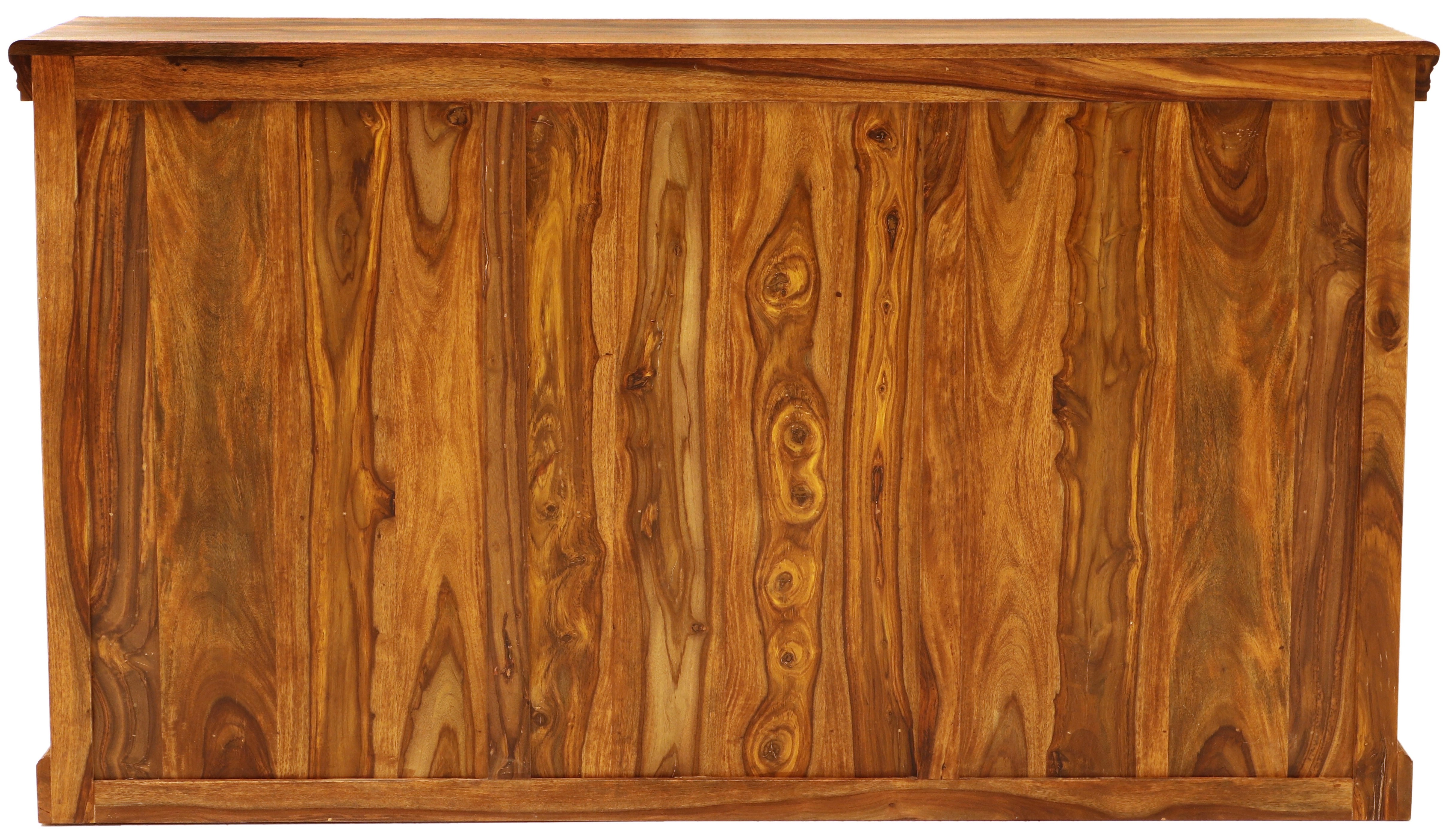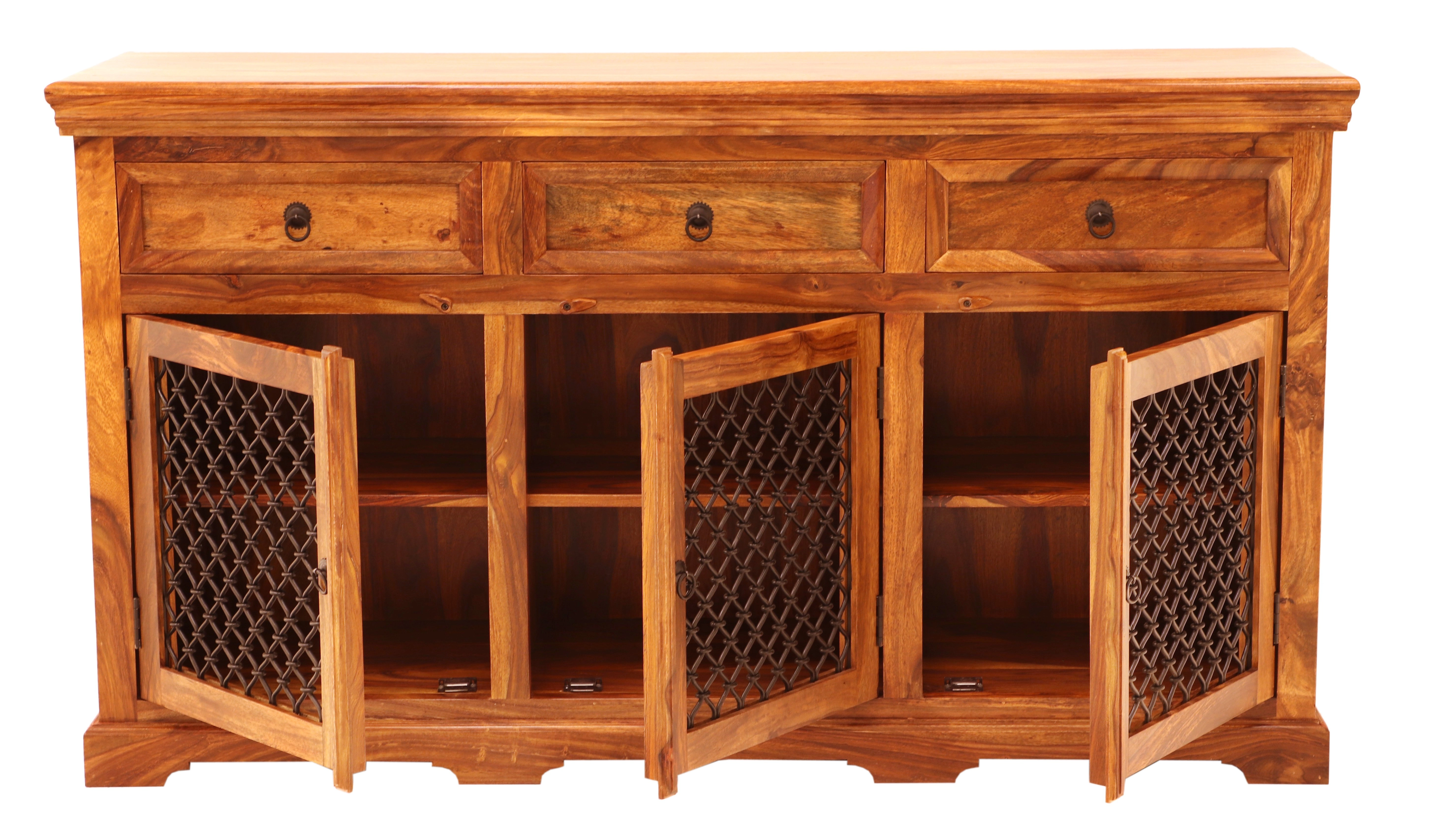Tato komoda obsahuje tři zásuvky v horní části a troje spodní dvířka s kovovými úchyty a výpletem, které dodávají moderní šmrnc celkovému designu. Je to ideální řešení pro uložení oblečení, domácích potřeb nebo jiných předmětů, které potřebujete mít po ruce. Rustikální komoda se tak stává nejen praktickým kusem nábytku, ale také stylovým doplňkem, který přináší atmosféru daleké Indie do vašeho domova.