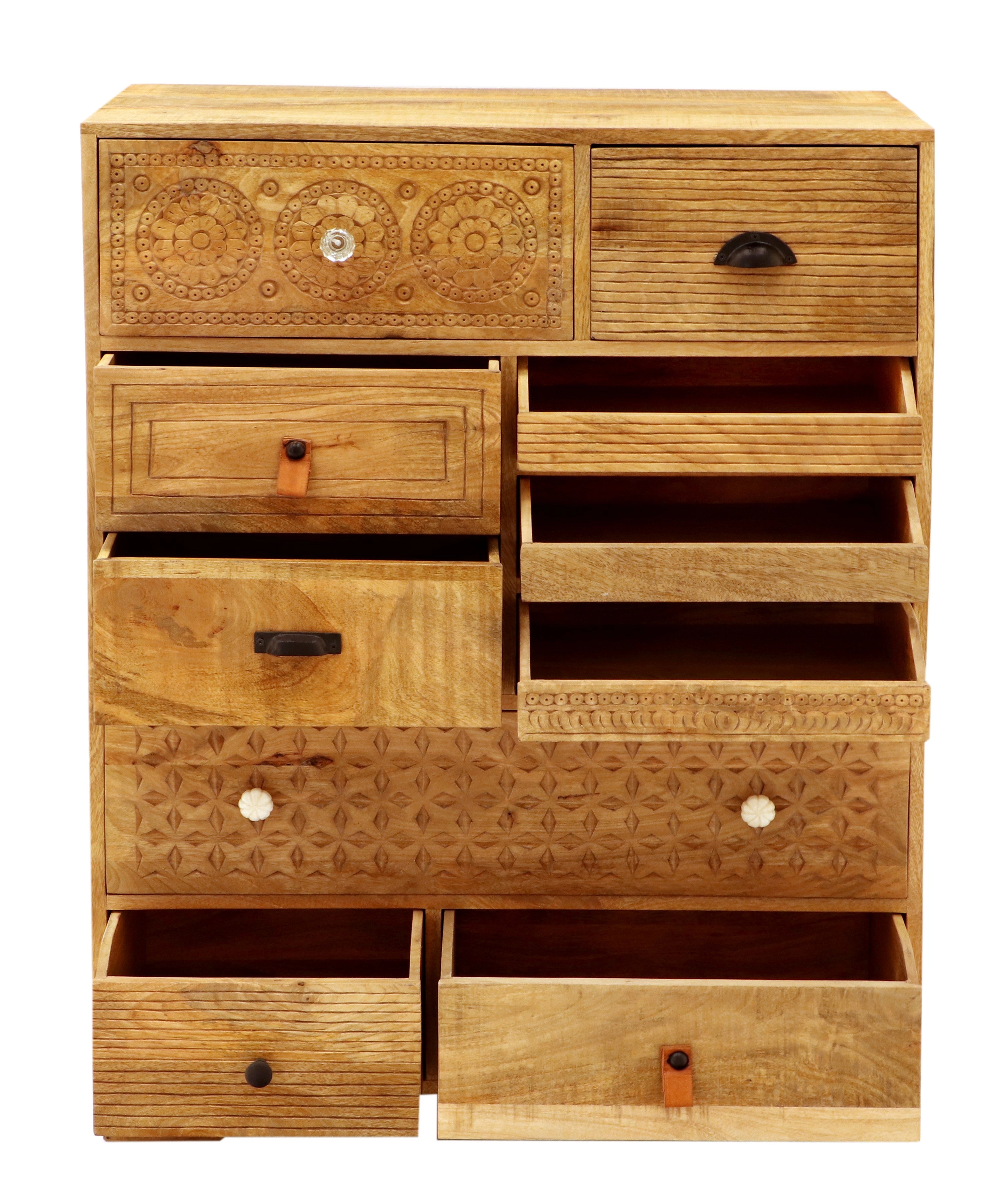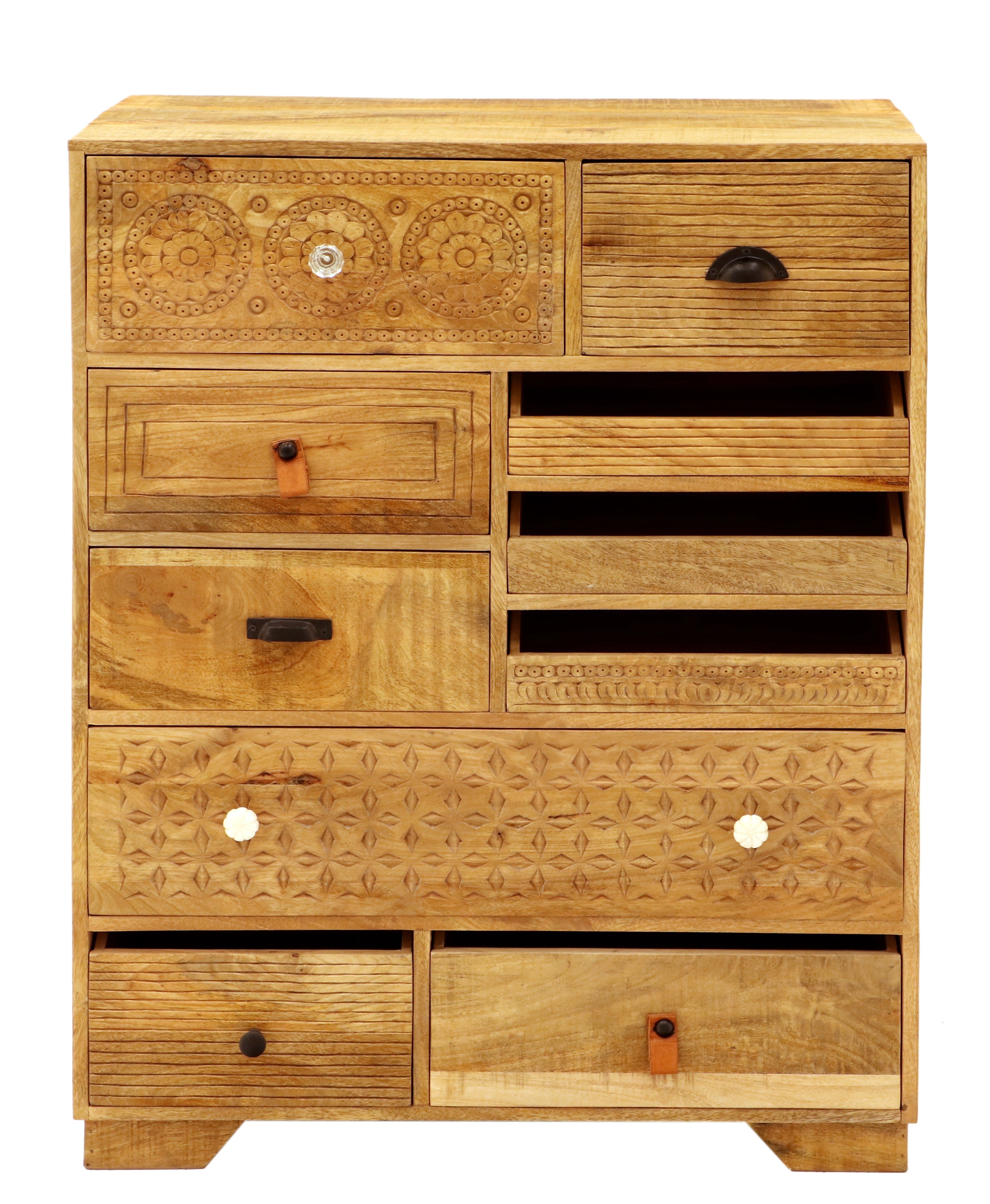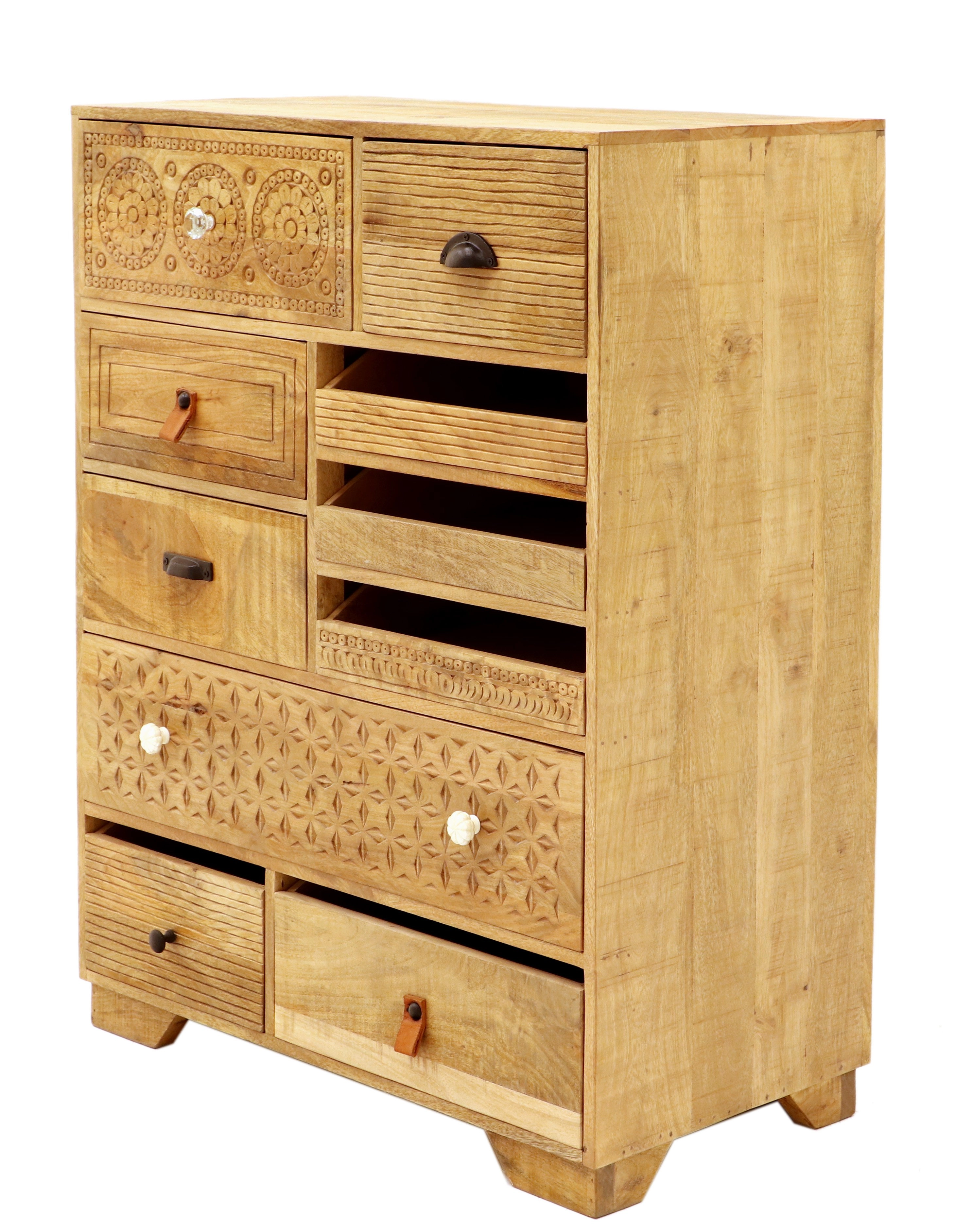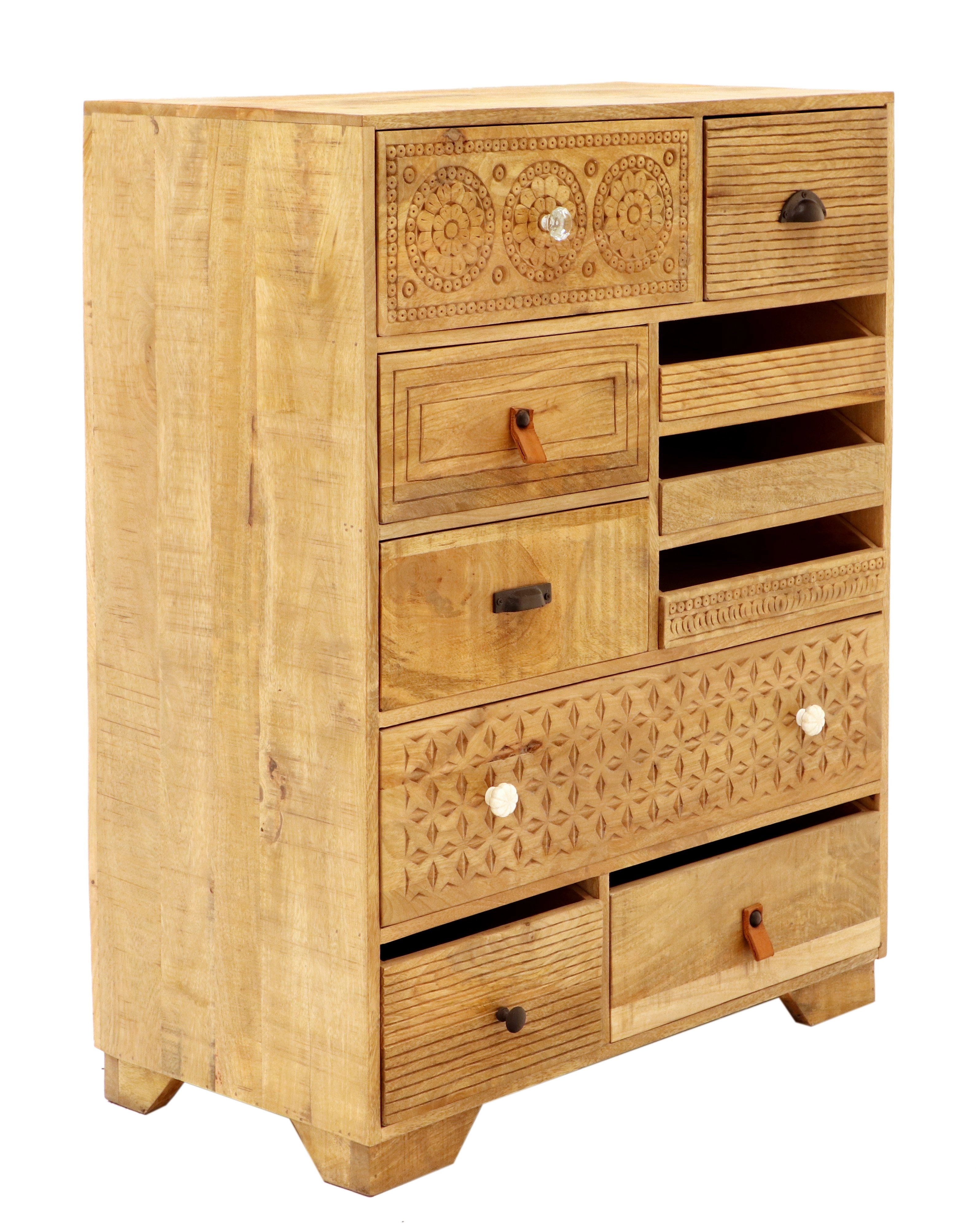 S rozměry 90 cm na šířku, 45 cm na hloubku a 115 cm na výšku poskytuje tato komoda prostorné úložné řešení pro vaši ložnici nebo libovolný jiný prostor. Unikátní design boho stylu s ručně vyřezávaným zdobením dává každému kousku nábytku jedinečný charakter, který nelze nalézt v masově produkovaných kusech. Rustikální komody z manga jsou skvělým doplňkem nejen do ložnice, ale také do obývacích pokojů či předsíní, kde dokážou vytvořit harmonickou atmosféru a propojit celkový design místnosti.