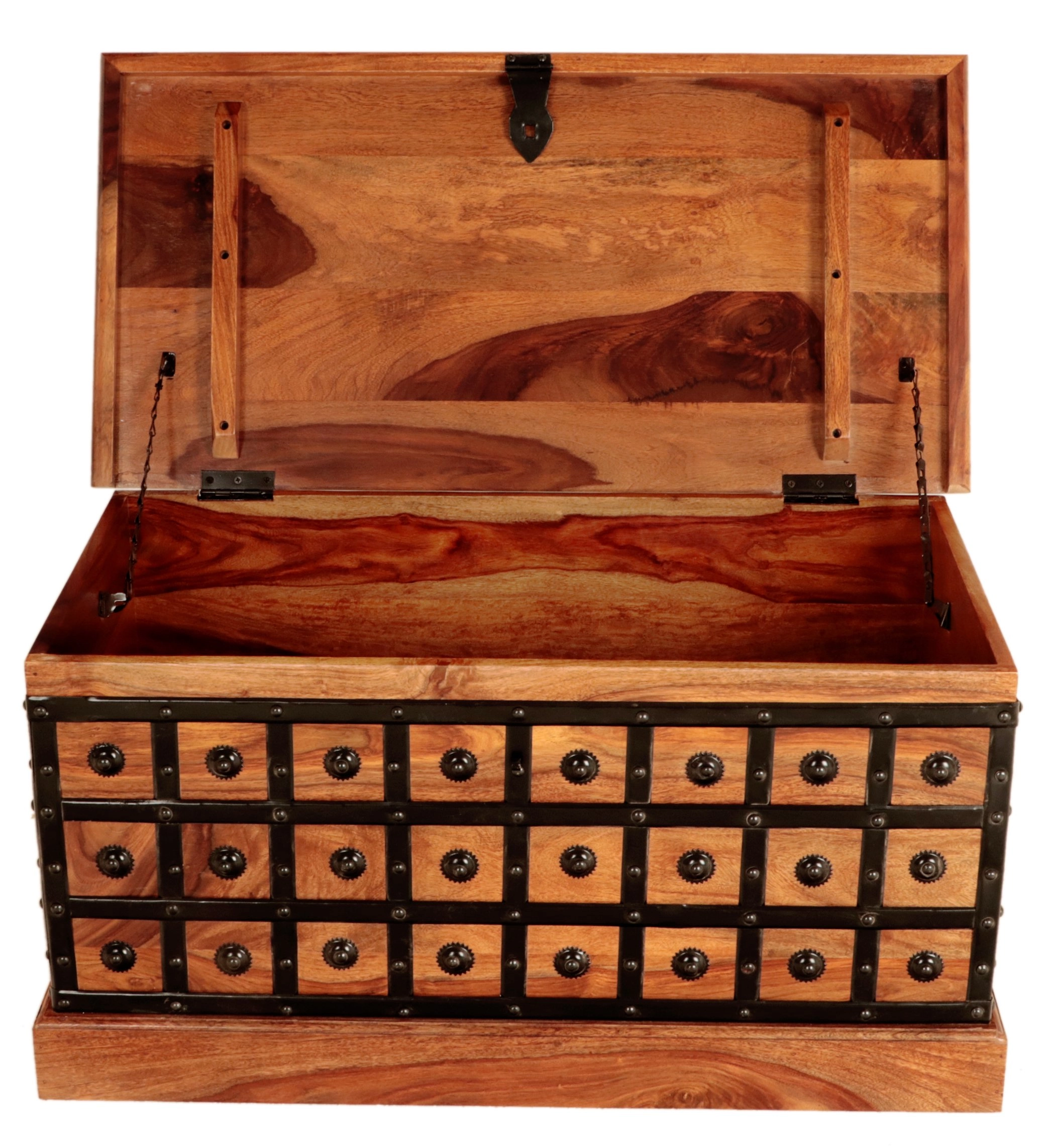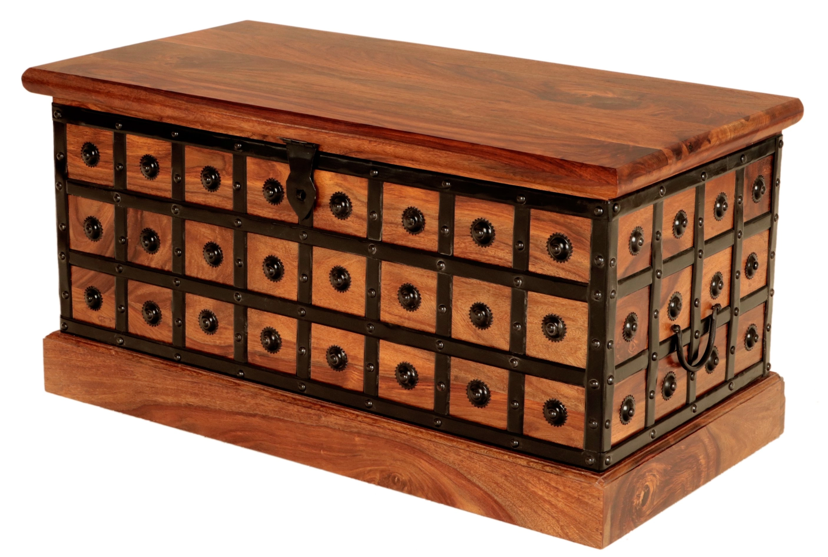 Palisandr, ze kterého je truhla vyrobena, je pro svou hustotu, zajímavou texturu a syté barevné odstíny vysoce ceněný materiál, jenž dává tomuto kusu nábytku nezaměnitelný vzhled a eleganci. Tento rustikální nábytek harmonicky zapadne jak do tradičních, tak do moderních interiérů a stane se dominantním prvkem Vašeho obývacího pokoje, ložnice či předsíně. K tomuto druhu nábytku lidé často pořizují další rustikální kousky, jako jsou komody, konferenční stolky, knihovny a jídelní stoly, které dohromady vytváří harmonický a ucelený vzhled prostoru.