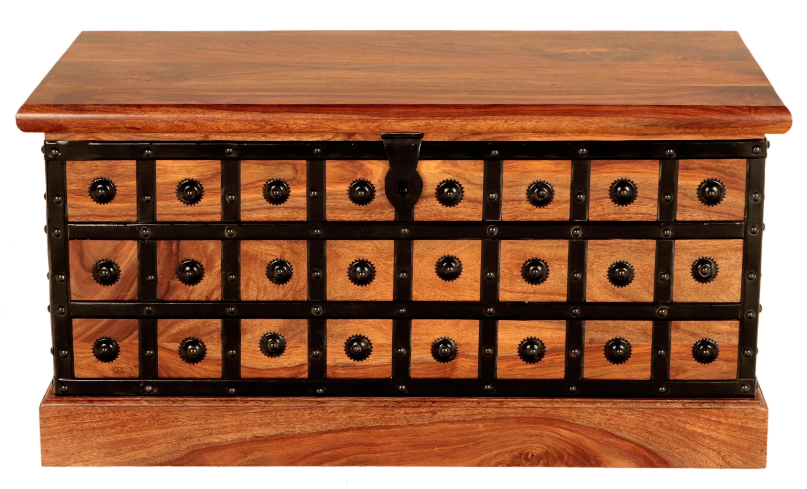 Rustikální truhla 90x45x45 z masivu palisandr je jedinečný kus rustikálního nábytku, který Vás okouzlí svým exkluzivním designem a prvotřídním řemeslným zpracováním. Tato truhla, pocházející z Indie, přináší do Vašeho interiéru nádech exotiky a autenticity. Vyrobena z kvalitního masivního palisandru, nabízí nejen estetický vzhled, ale i vysokou odolnost a trvanlivost. S rozměry 90 cm na šířku, 45 cm na hloubku a 45 cm na výšku poskytuje dostatek úložného prostoru pro Vaše cennosti, prádlo nebo třeba hračky. Je součástí populární Kolekce JALI, která je známá precizními řezbami a detailními kovovými ozdobami.