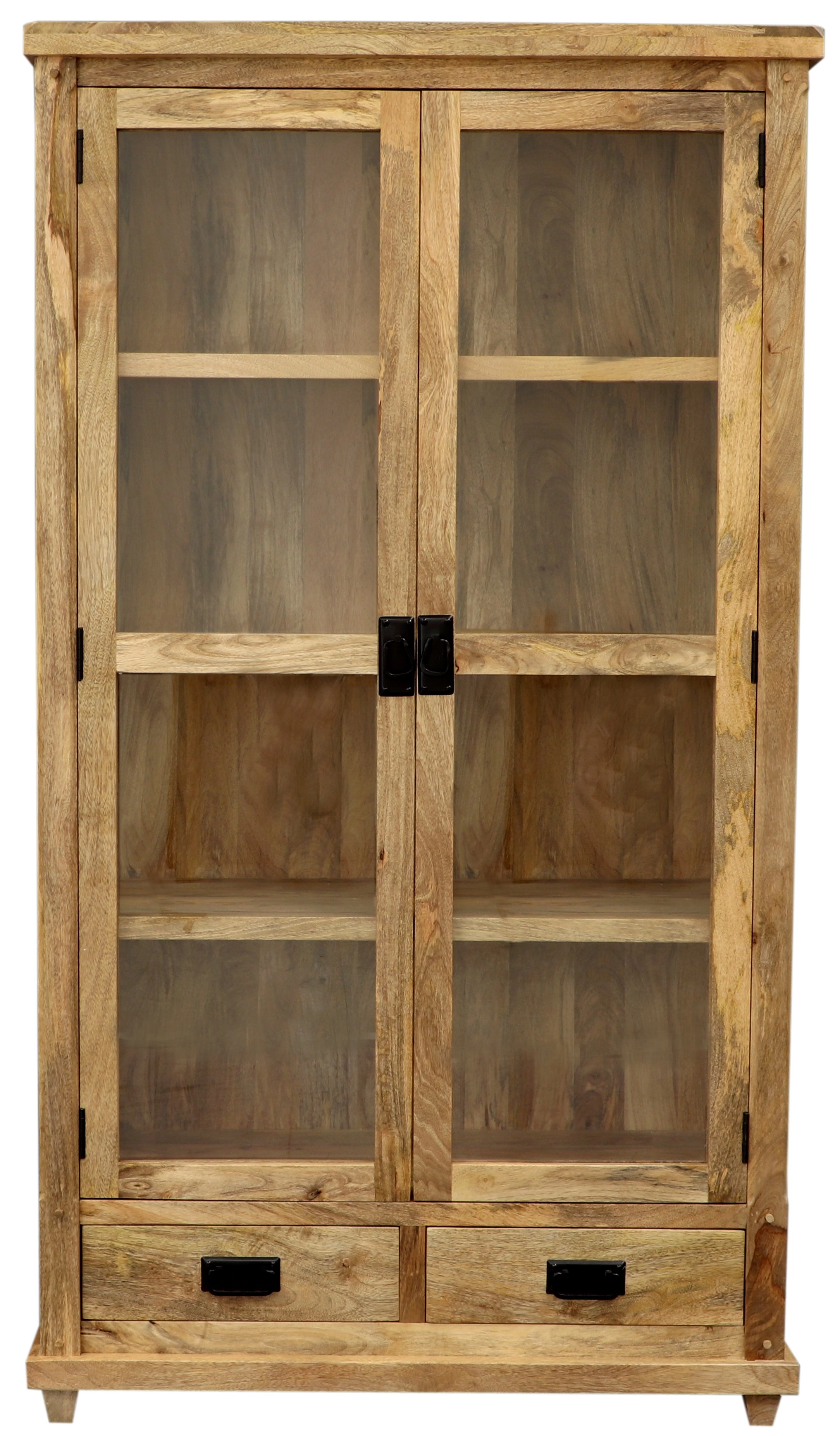 Rustikální vitrina z masivního dřeva mango 100x180x45 se stane středobodem každého obývacího pokoje. Tato rustikální vitrína přináší harmonii mezi přírodní krásou a funkčností. Díky svému původu z Indie každá vitrina vypráví příběh o pečlivém řemeslném zpracování a jedinečném designu. Vyrobena z kvalitního dřeva manga, je zárukou dlouhé životnosti a odolnosti. Vitrína nabízí prosklené dveře, za kterými se skrývá několik polic určených k uschování a vystavení vašich oblíbených dekorací či památek.