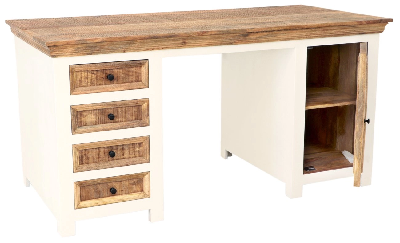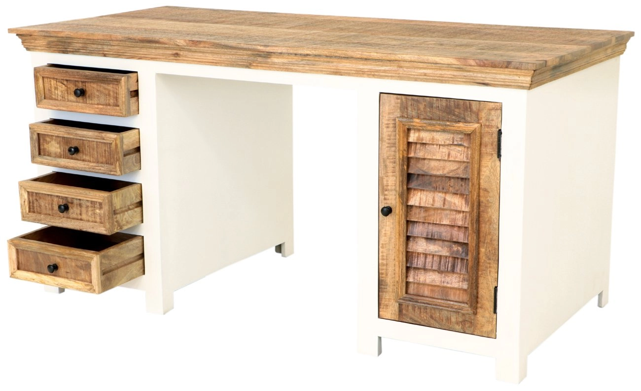 S šířkou 160 cm, hloubkou 76 cm a výškou 80 cm poskytuje dostatek prostoru pro efektivní práci a uspořádání. Stůl je vybaven čtyřmi praktickými zásuvkami a jedněmi dvířky s úložným prostorem, což umožňuje snadné uspořádání a úschovu vašich dokumentů a kancelářských potřeb. Umělecké řemeslné zpracování zaručuje, že každý kus je unikátním dílem, které vaše prostředí oživí svou rustikální estetikou.