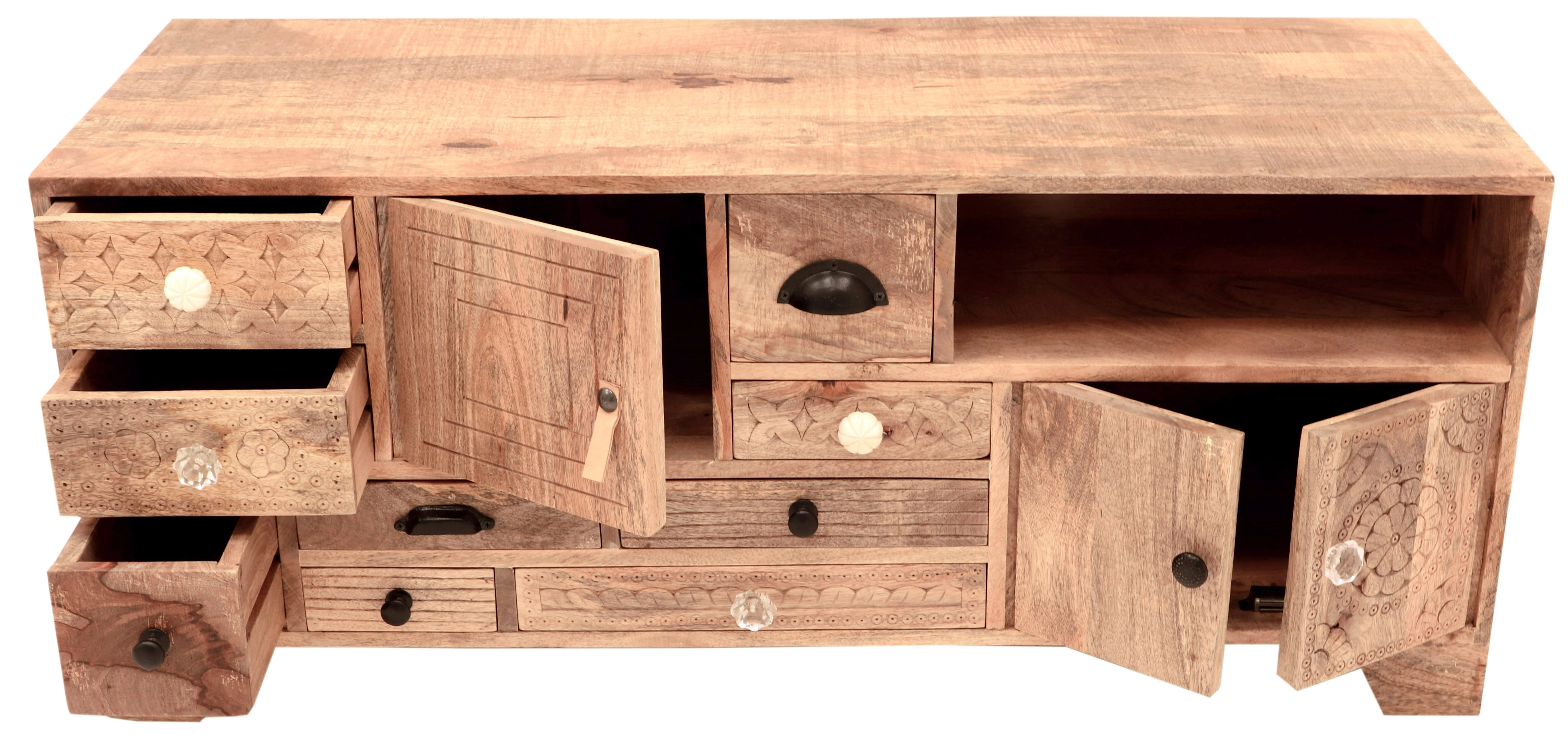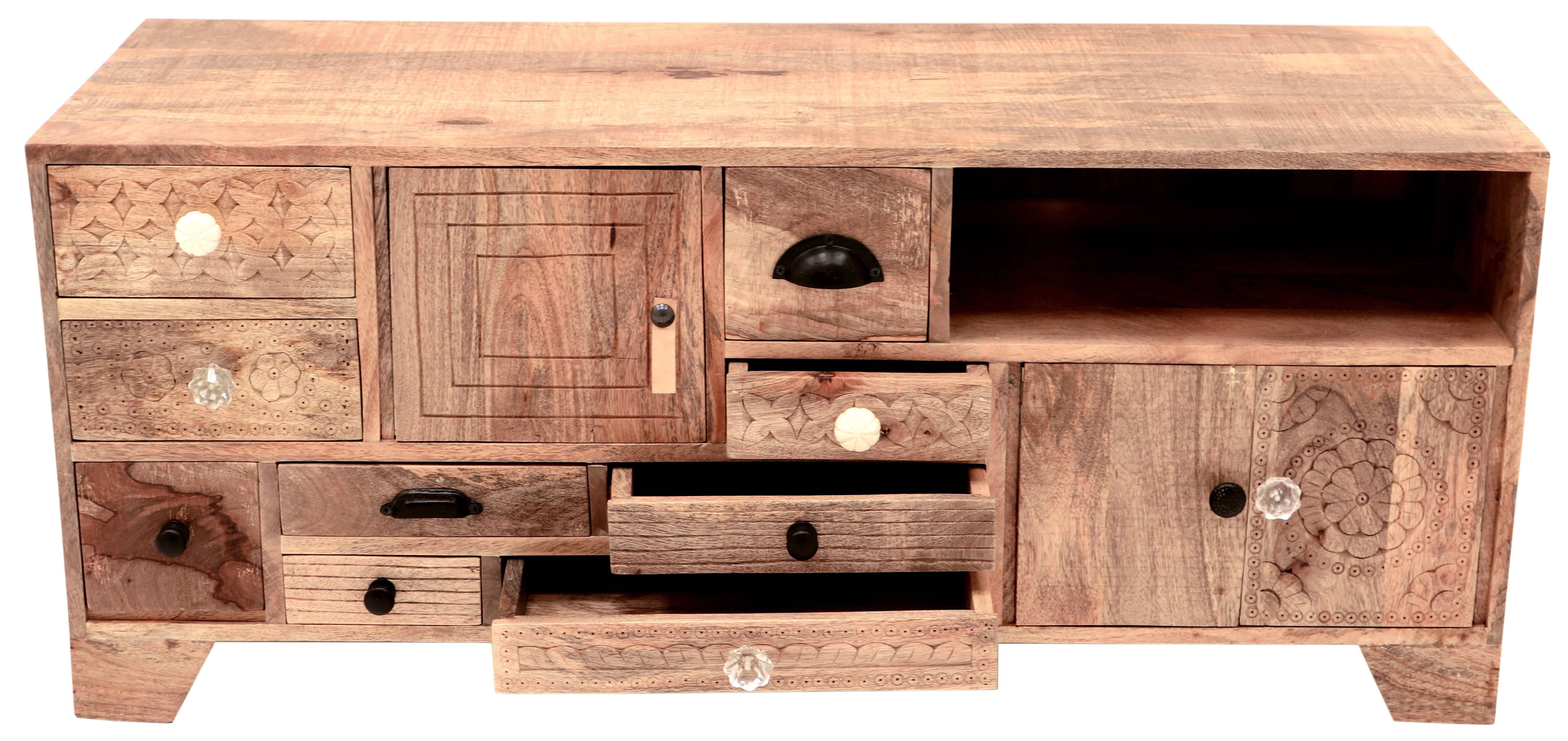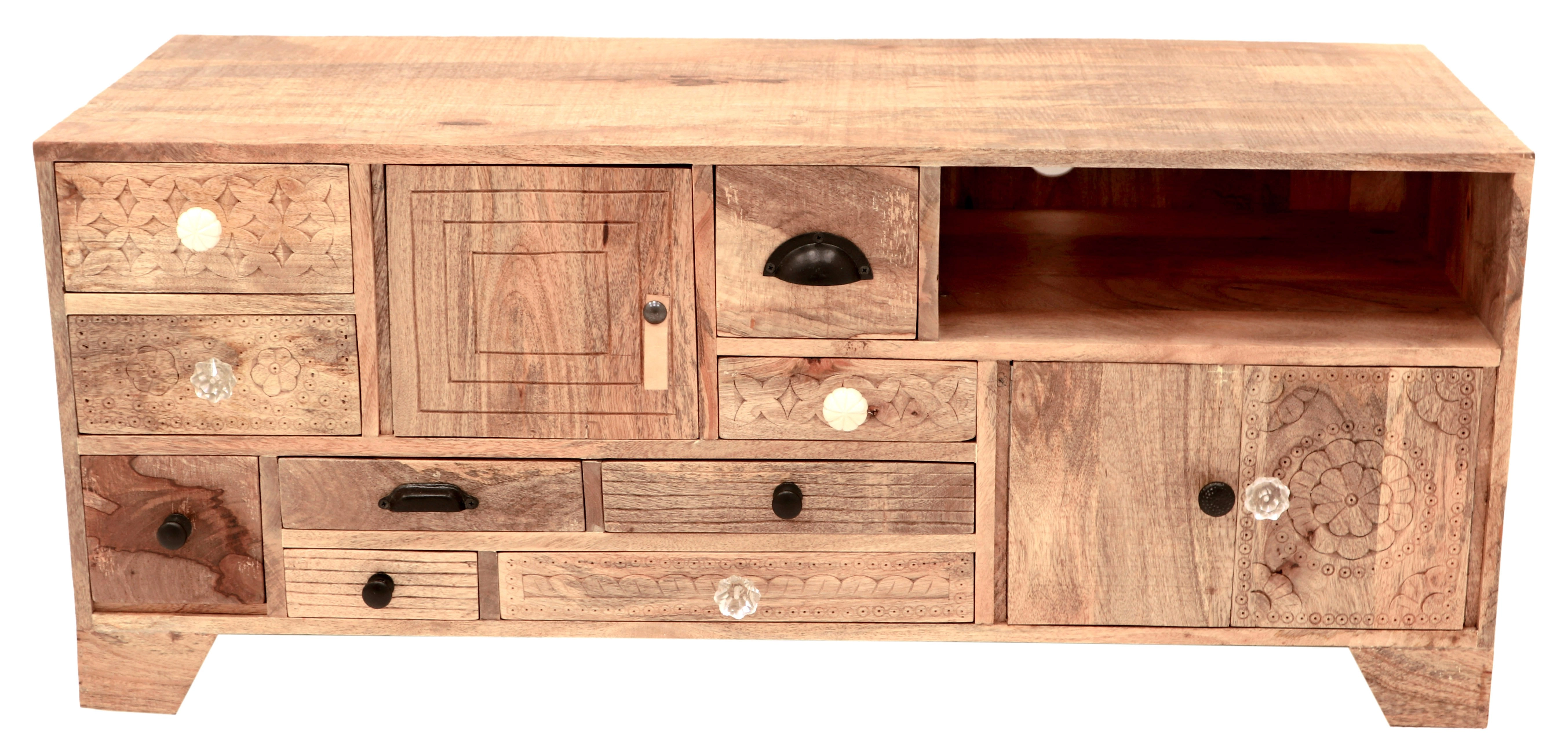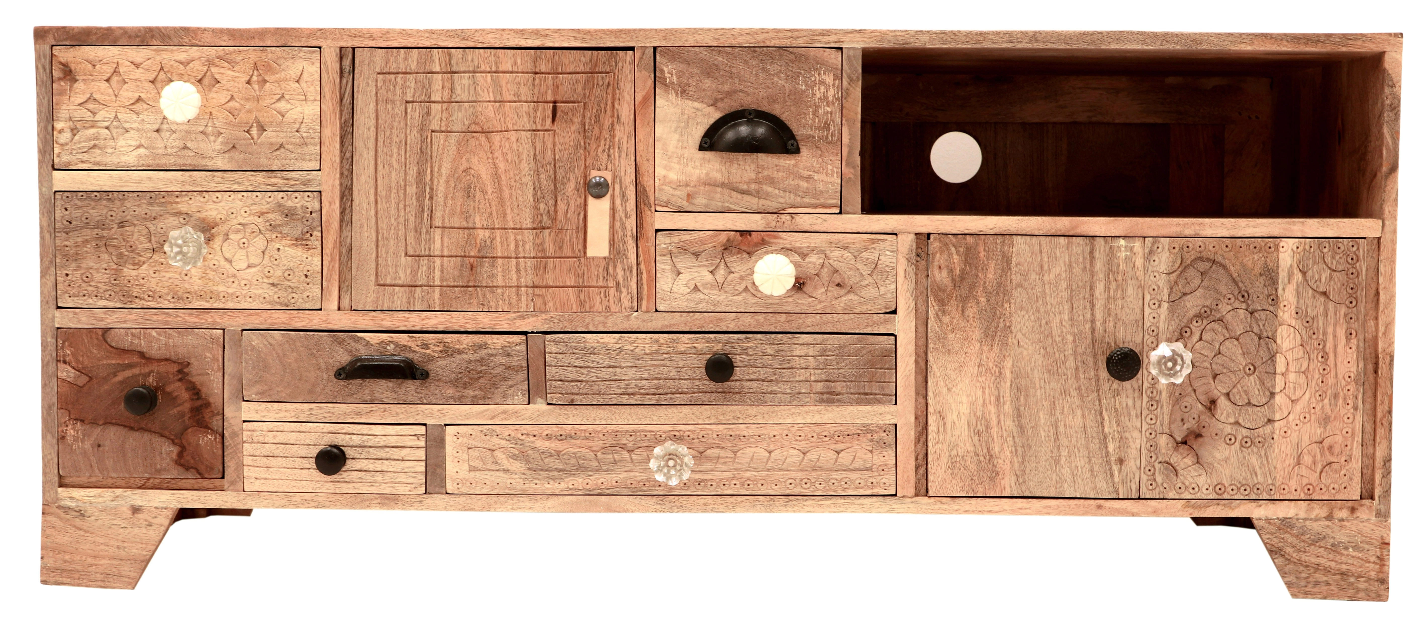 Objevte špičkovou kombinaci elegance a funkčnosti s naším rustikálním TV stolkem z dřeva mango o rozměrech 120x50x45 cm. Tento unikátní kus rustikálního nábytku pochází z Indie a jeho majestátní provedení odkazuje na bohatou tradici ručního řemesla. Rustikální TV stolek je mistrovským dílem, zdobeným ručně vyřezávanými ornamenty na dvířkách šuplíků, které mu dodávají jedinečný umělecký nádech. Praktický design nabízí množství malých šuplíků s různými úchytkami, což zajišťuje snadné otevírání a zavírání, a poskytuje dostatek úložného prostoru pro všechny vaše audio-vizuální potřeby.