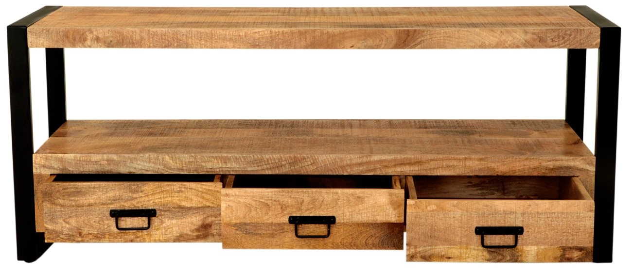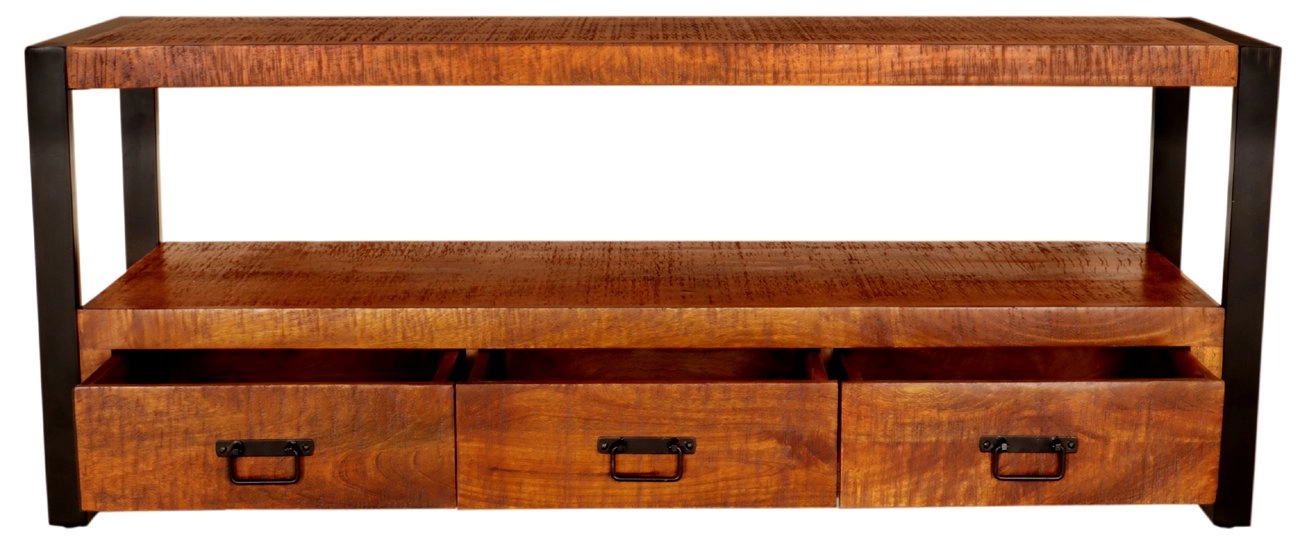 Stolek je opatřen třemi prostornými zásuvkami s kovovými úchyty, které dodávají výrobku autentický rustikální vzhled a zároveň zajišťují praktické ukládání. Police poskytuje optimální úložný prostor, kde můžete snadno umístit své oblíbené knihy, DVD nebo jiné mediální zařízení. Jeho rustikální design osloví ty, kteří si cení tradičního stylu a hledají nábytek s hřejivou a útulnou atmosférou.