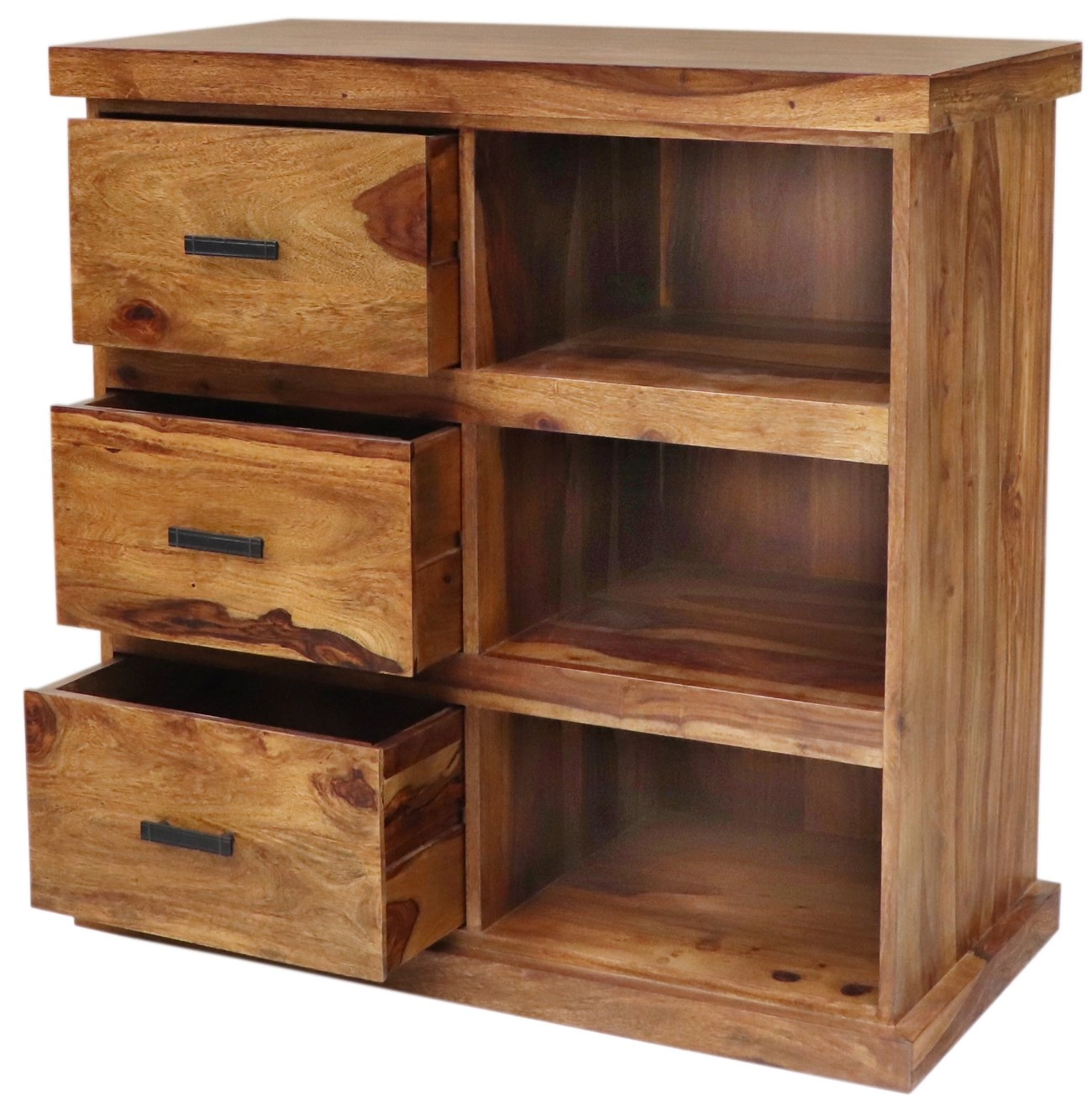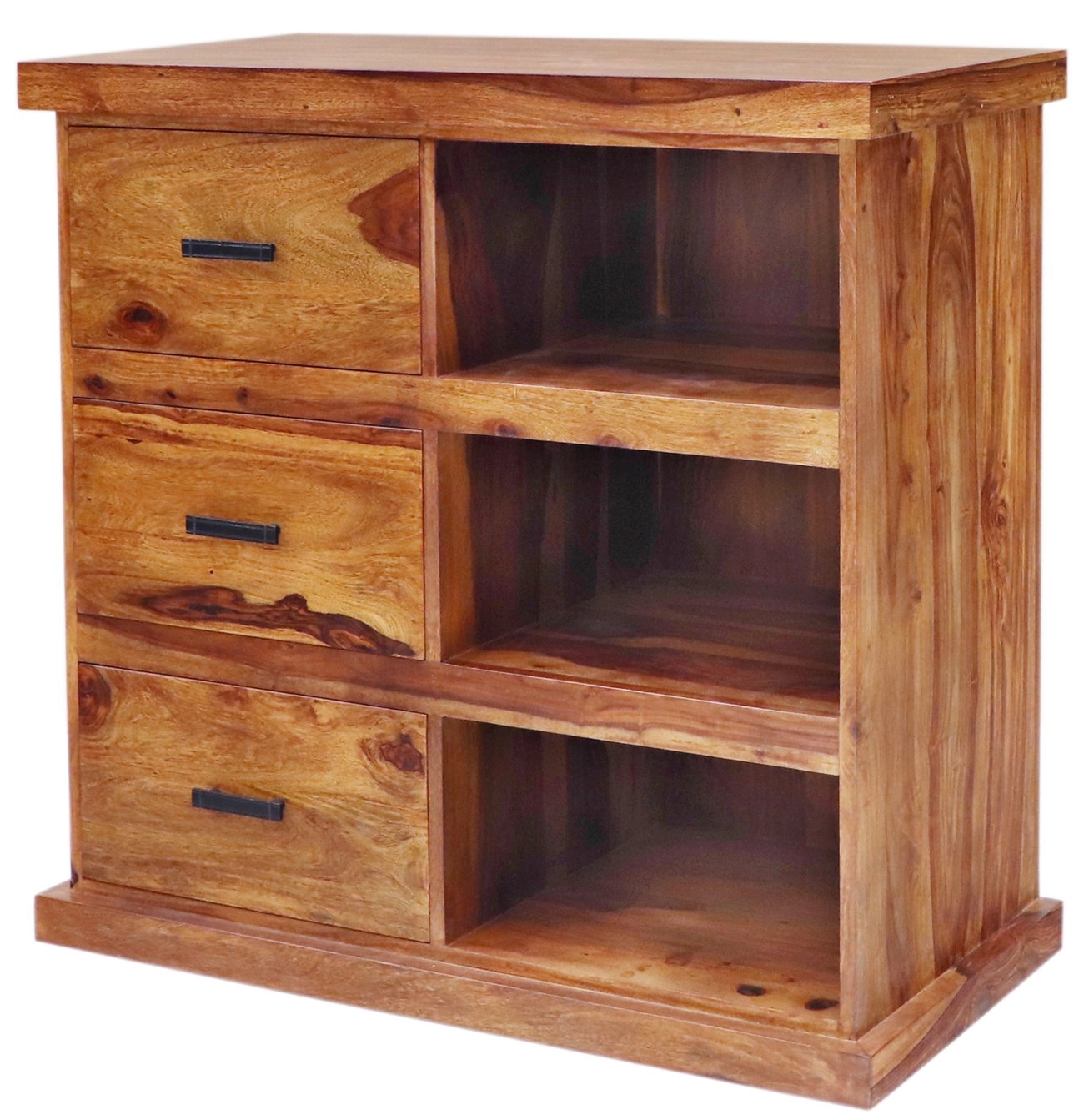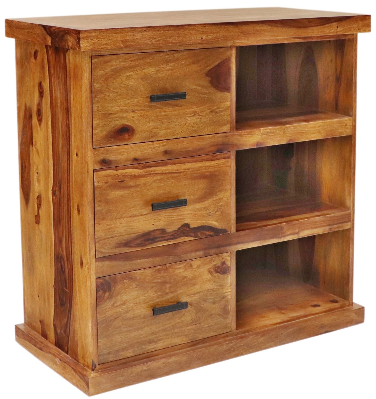 Dřevěné komody jako tato jsou velmi oblíbené pro svou univerzálnost a praktičnost. Díky třem prostorným zásuvkám a třem otevřeným policím nabízí tato dřevěná komoda dostatek úložného prostoru pro uložení vašich osobních věcí, oděvů nebo dekorací. Její rozměry - šířka 90 cm, hloubka 35 cm a výška 90 cm - ji činí ideální pro umístění do menších i větších prostor.