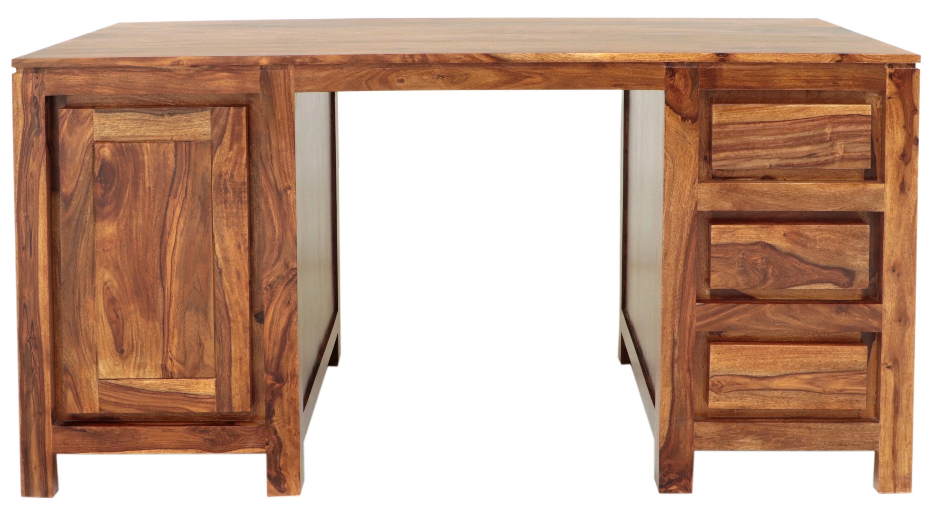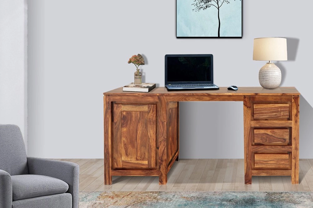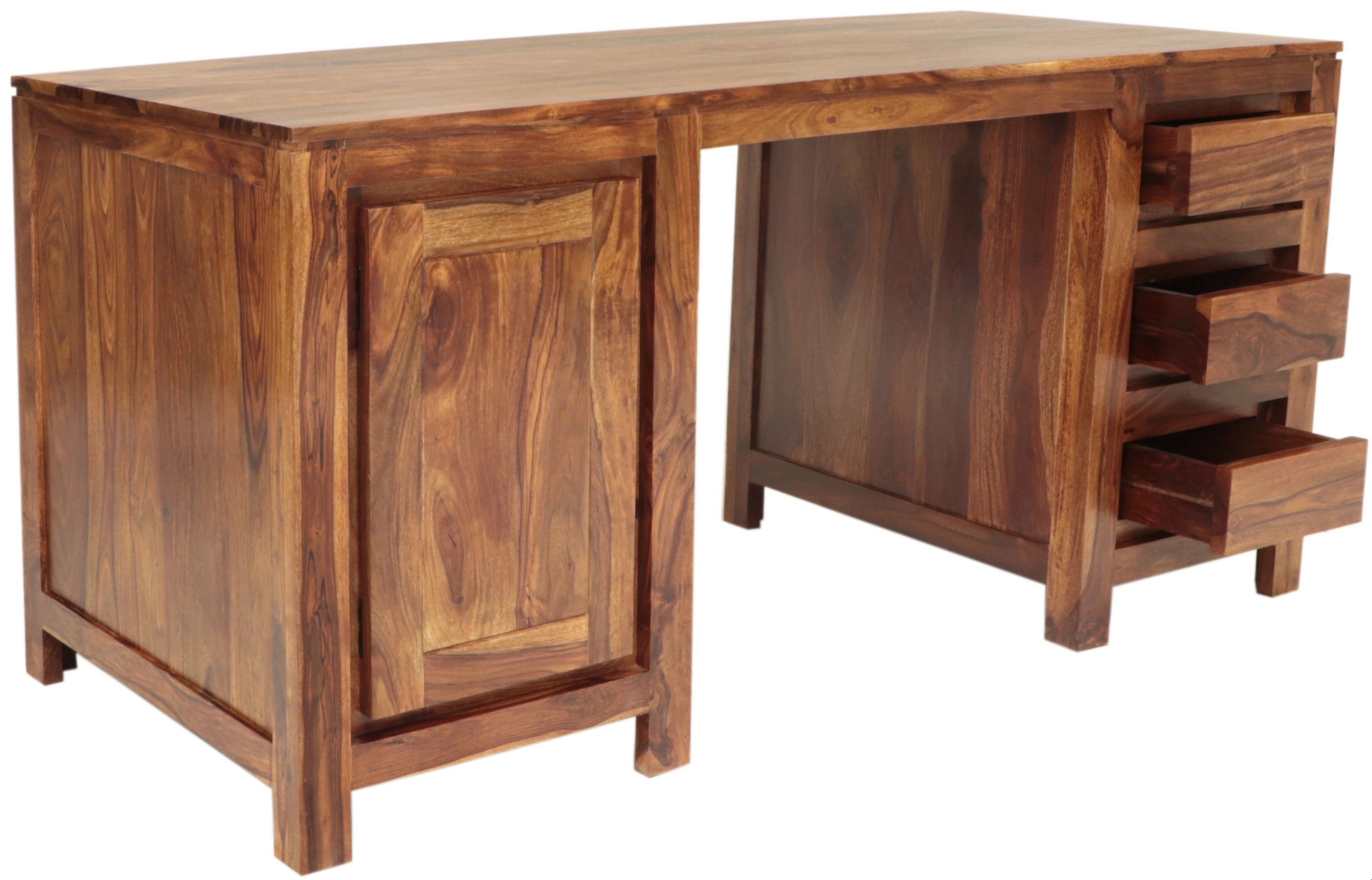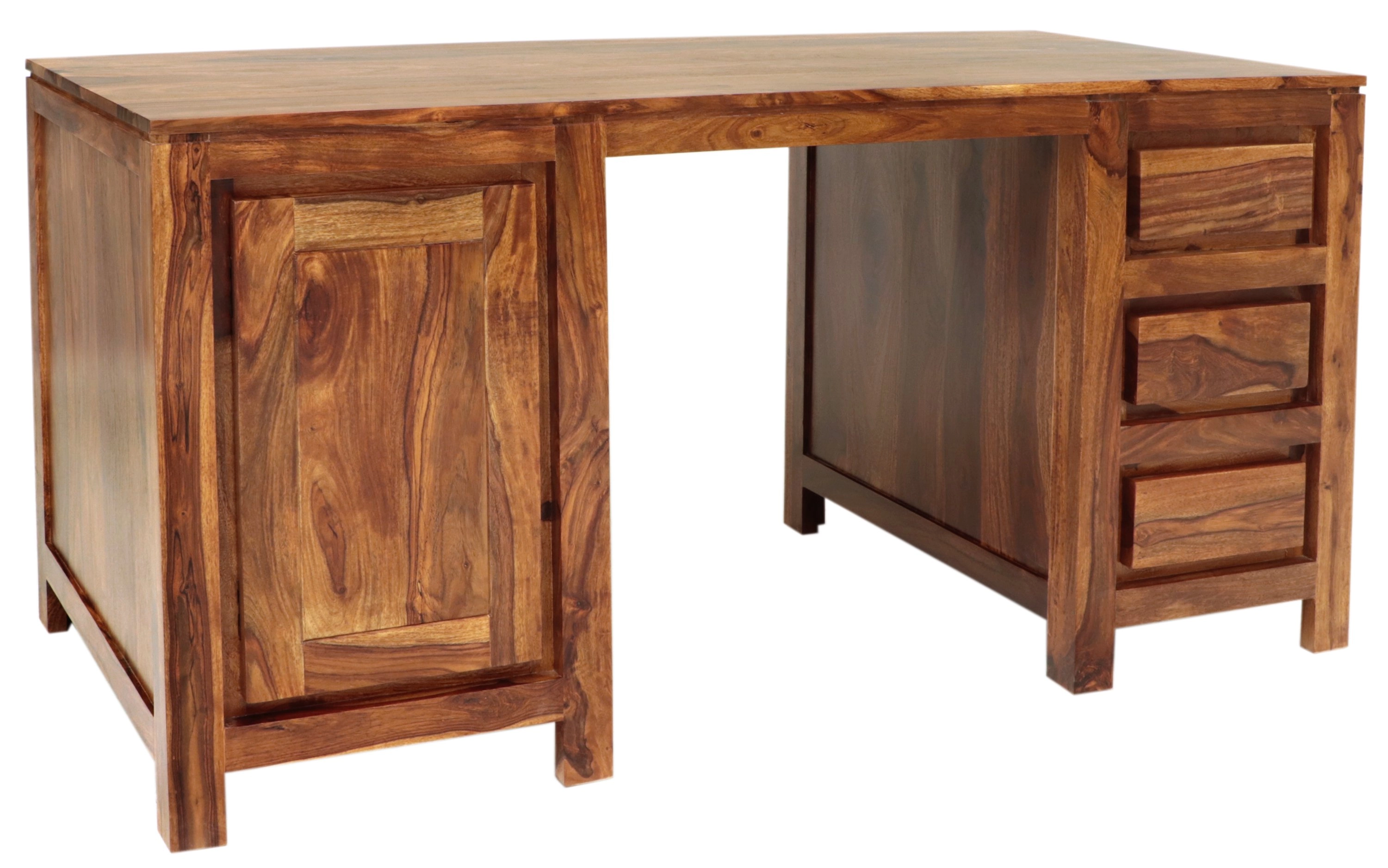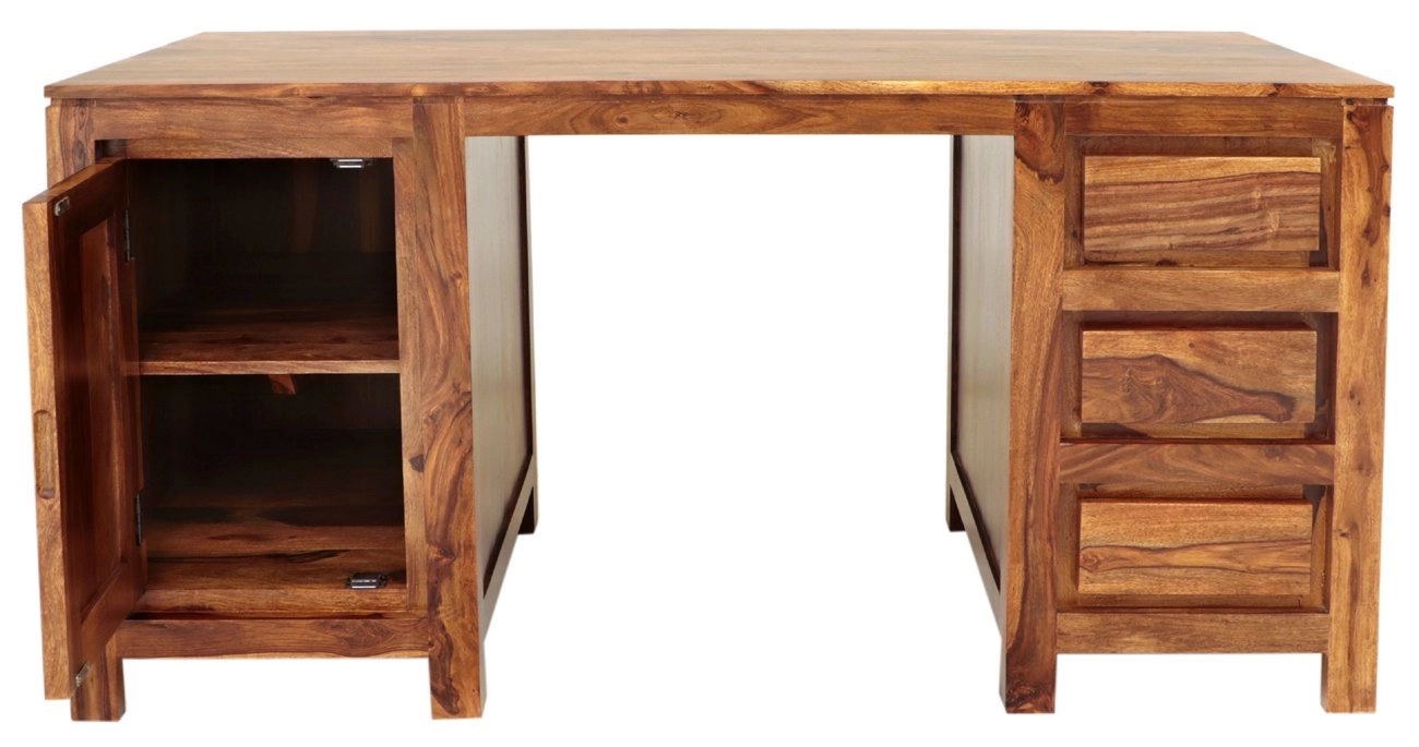 Stůl nabízí elegantní design s praktickým uspořádáním úložného prostoru. Je vybaven třemi prostornými zásuvkami a jedním dvířkem, které poskytují dostatek místa pro uložení všech vašich kancelářských potřeb. Jeho přirozený vzhled a teplá, bohatá textura z přírodního dřeva dodají vašemu interiéru pocit harmónie a elegance.