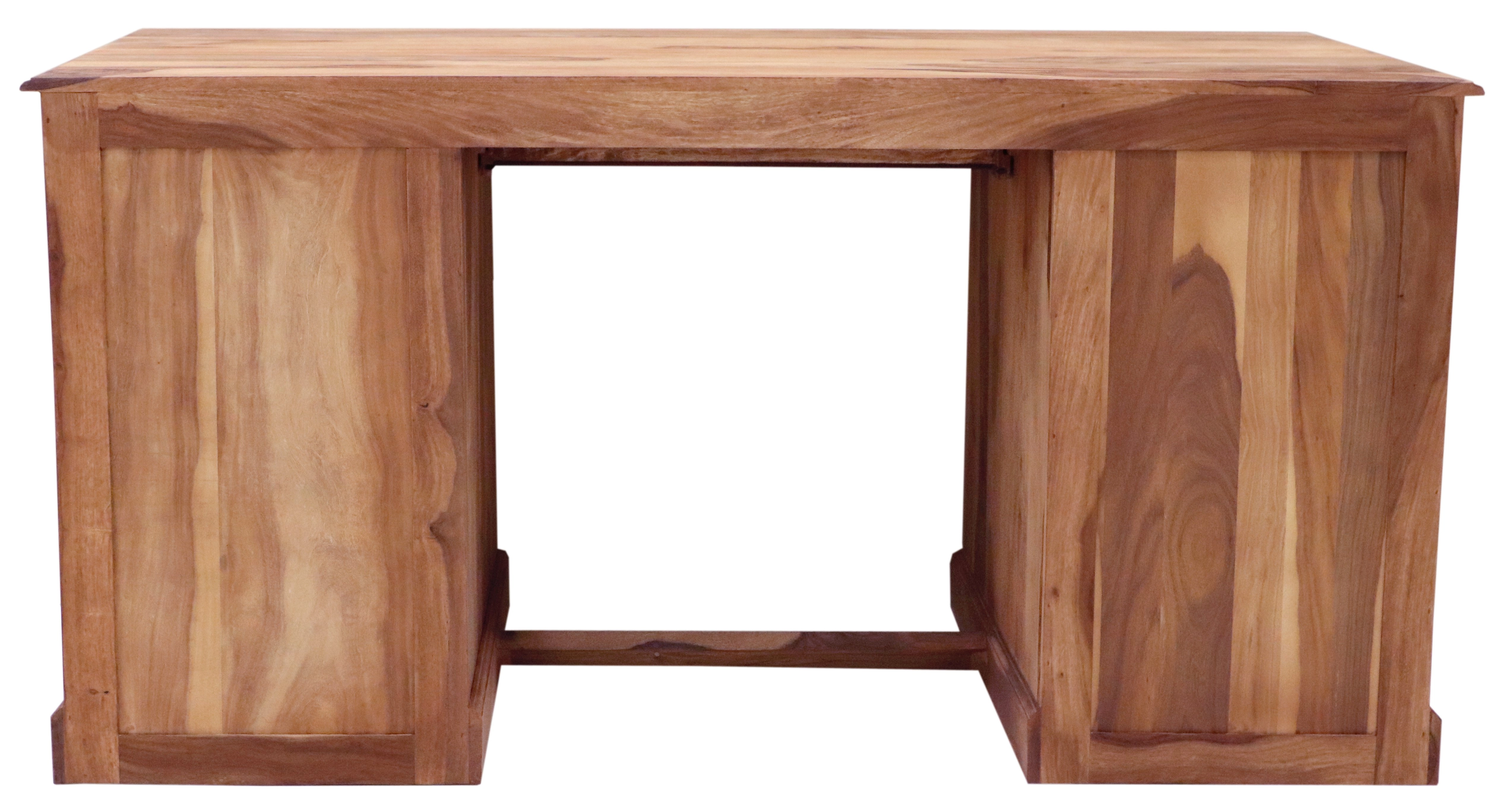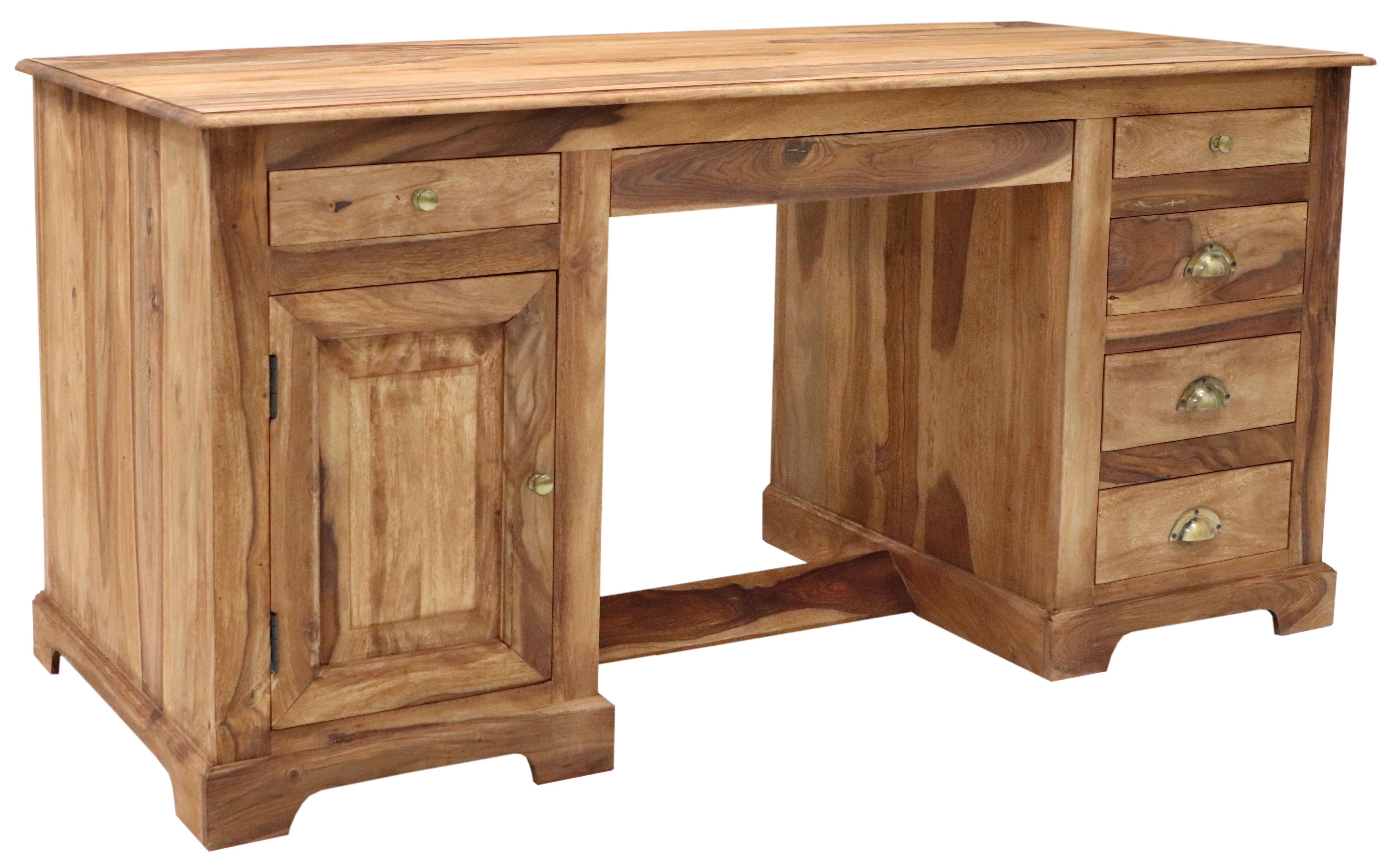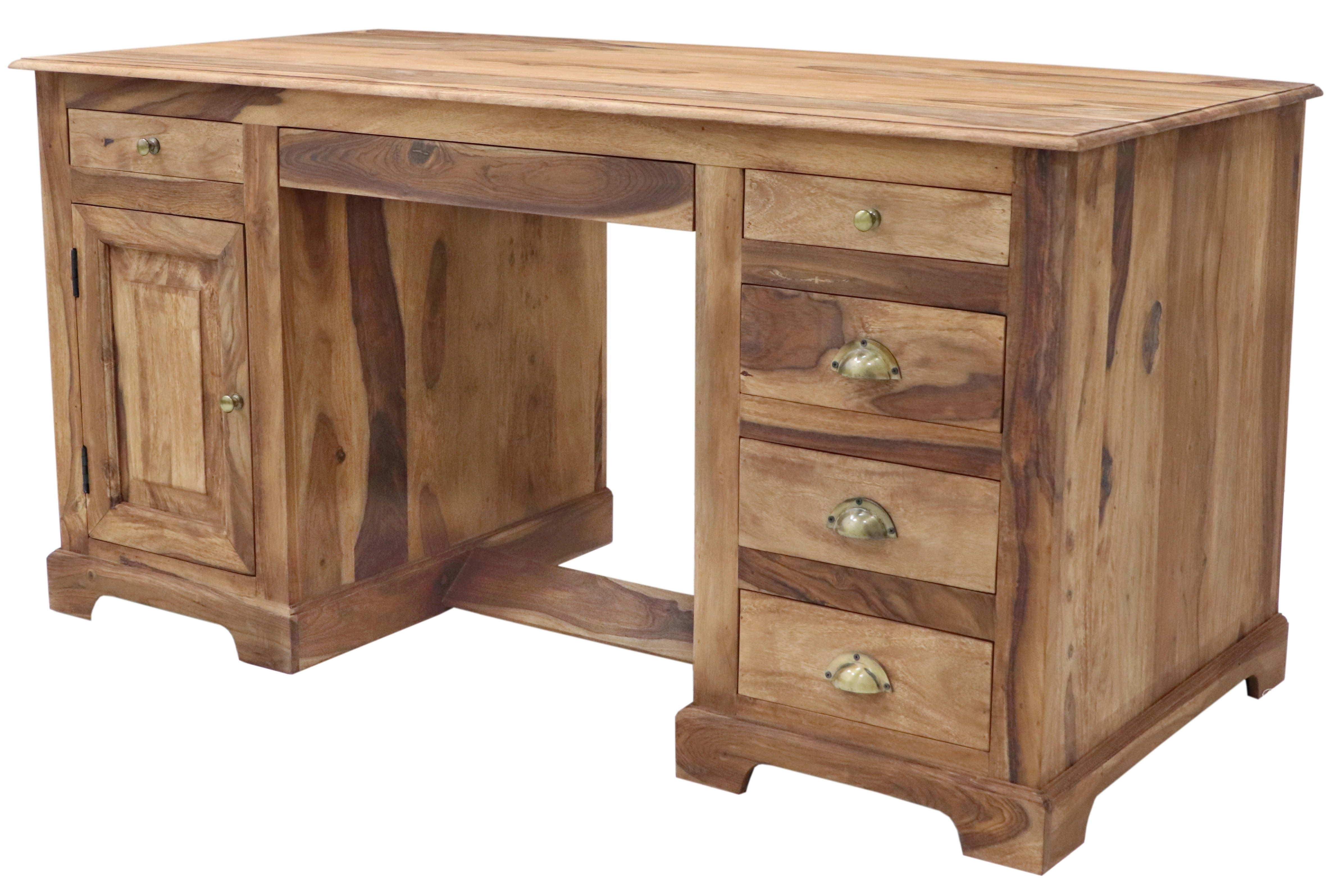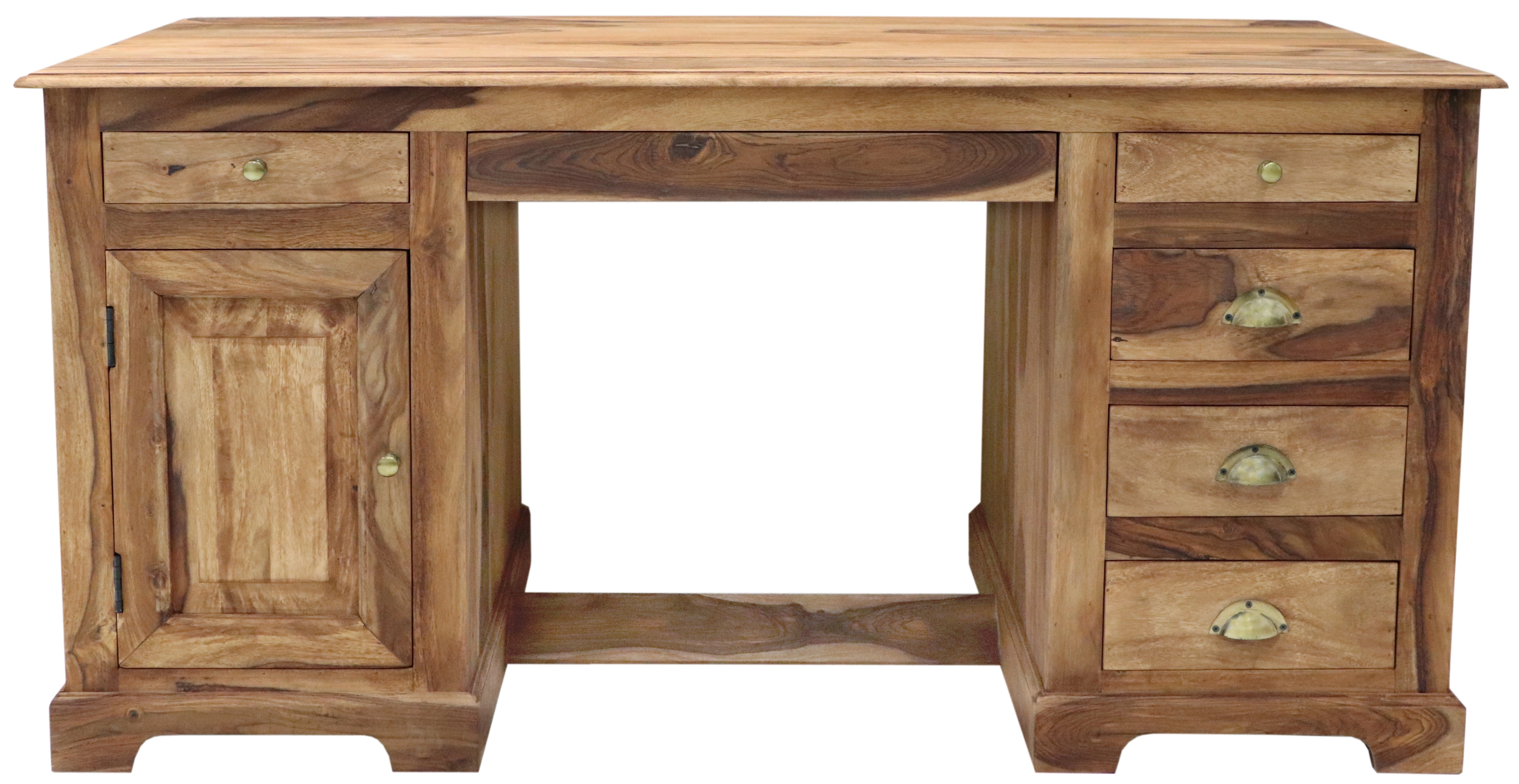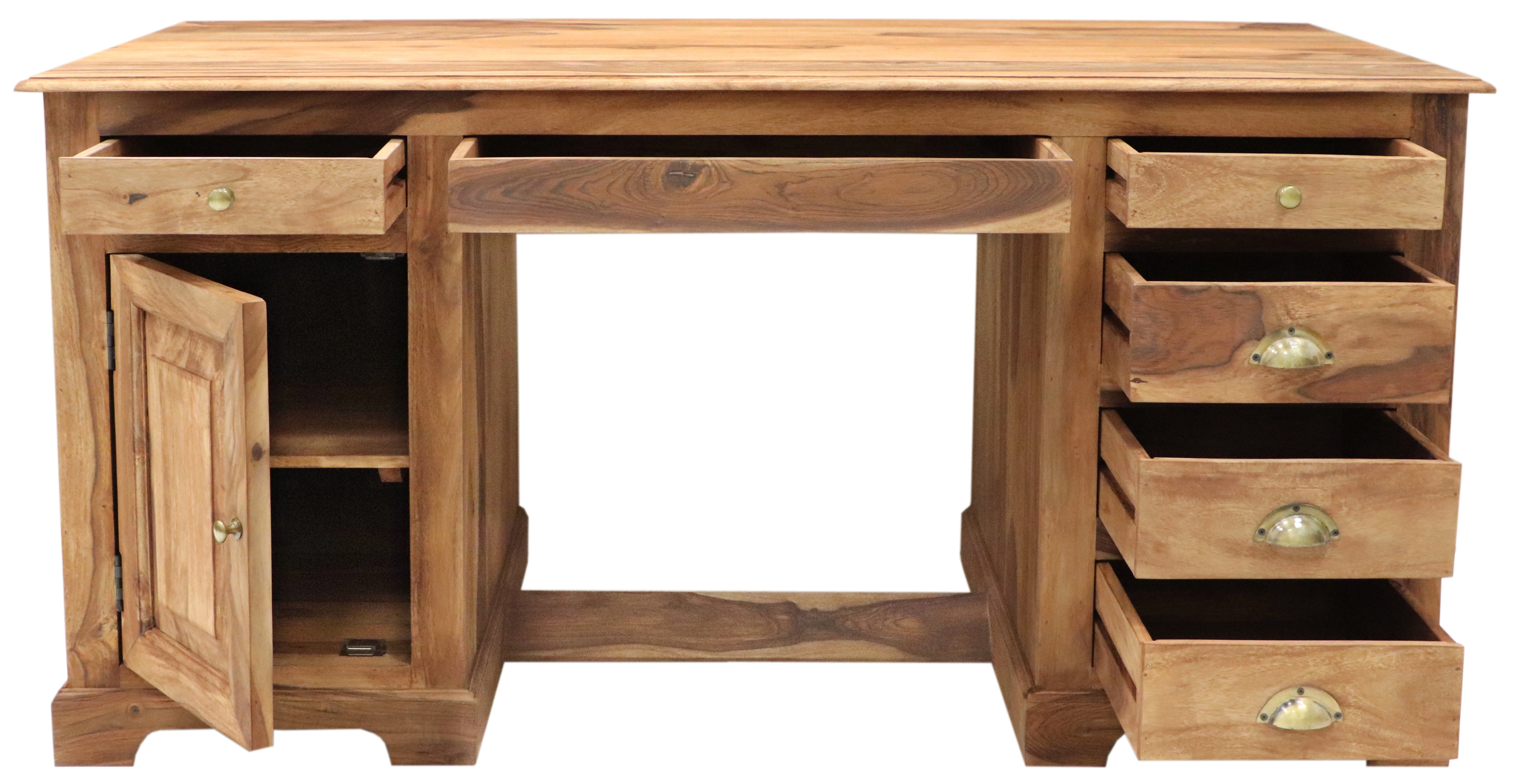 Psací stůl masiv se pyšní šesti prostornými zásuvkami vhodnými na uschování dokumentů či psacích potřeb, a jedněmi dvířky s elegantním kovovým úchytem, které dodávají styl a pohodlí. Díky kvalitnímu zpracování a nádherné struktuře dřeva bude tento stůl centrem pozornosti jakékoli místnosti.