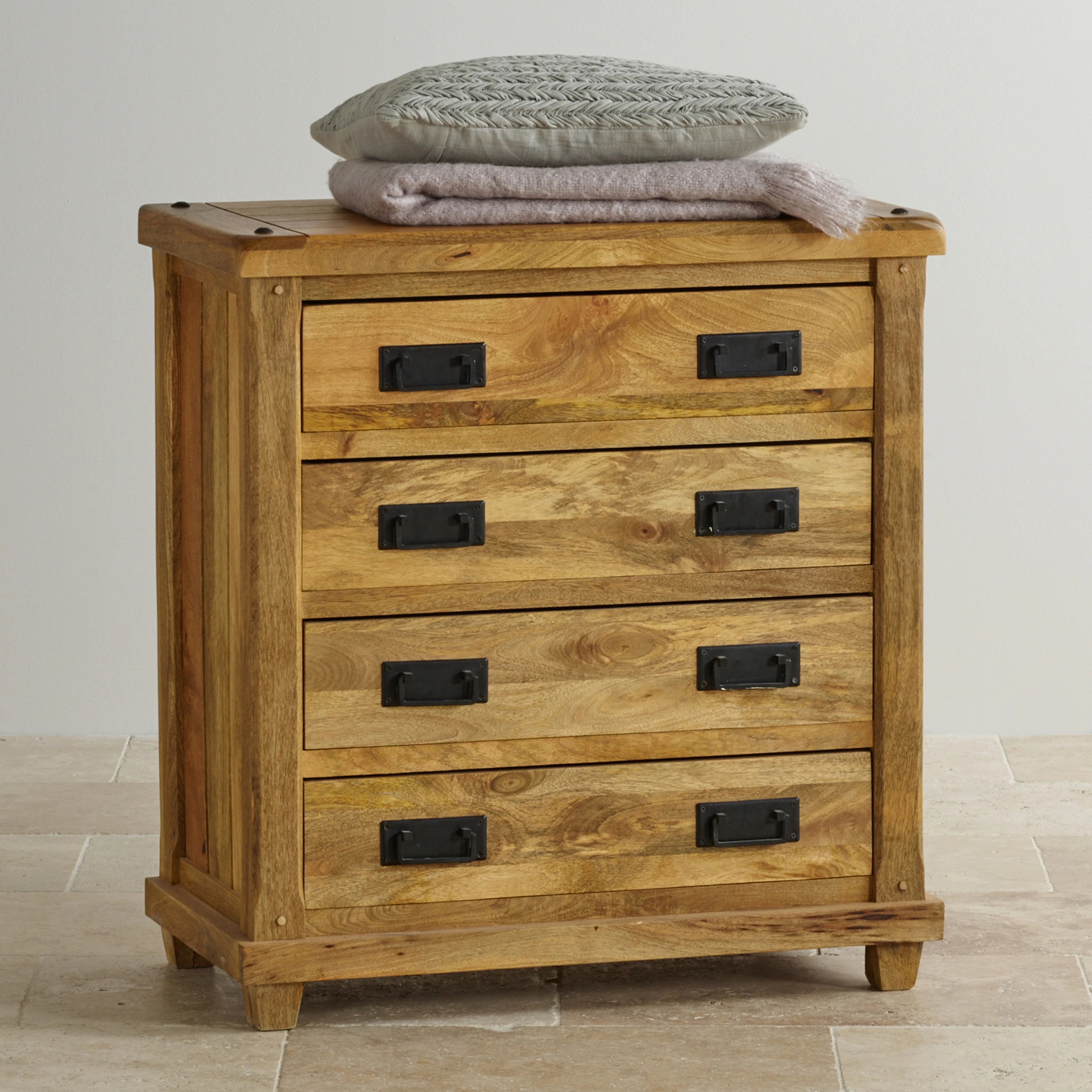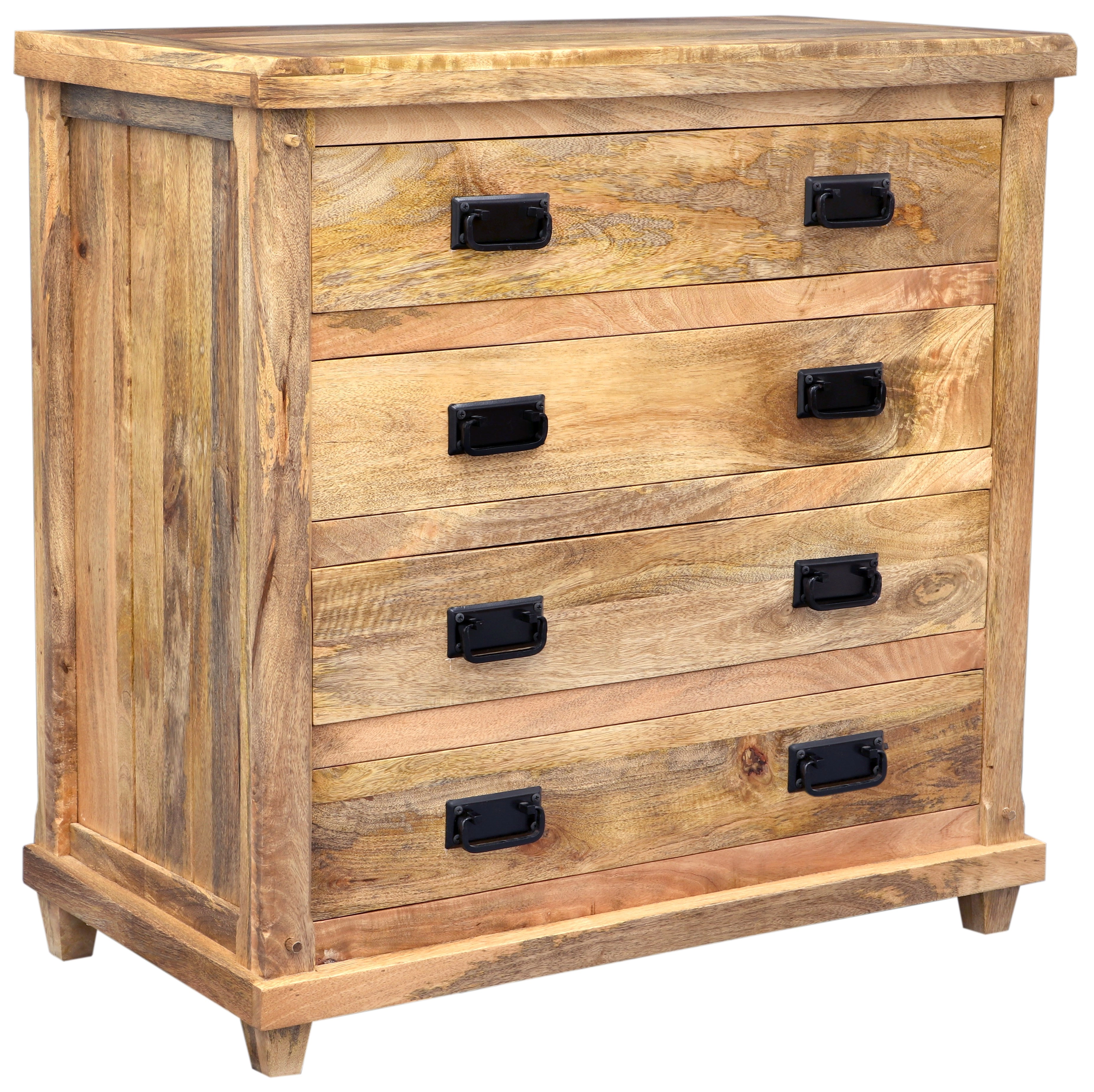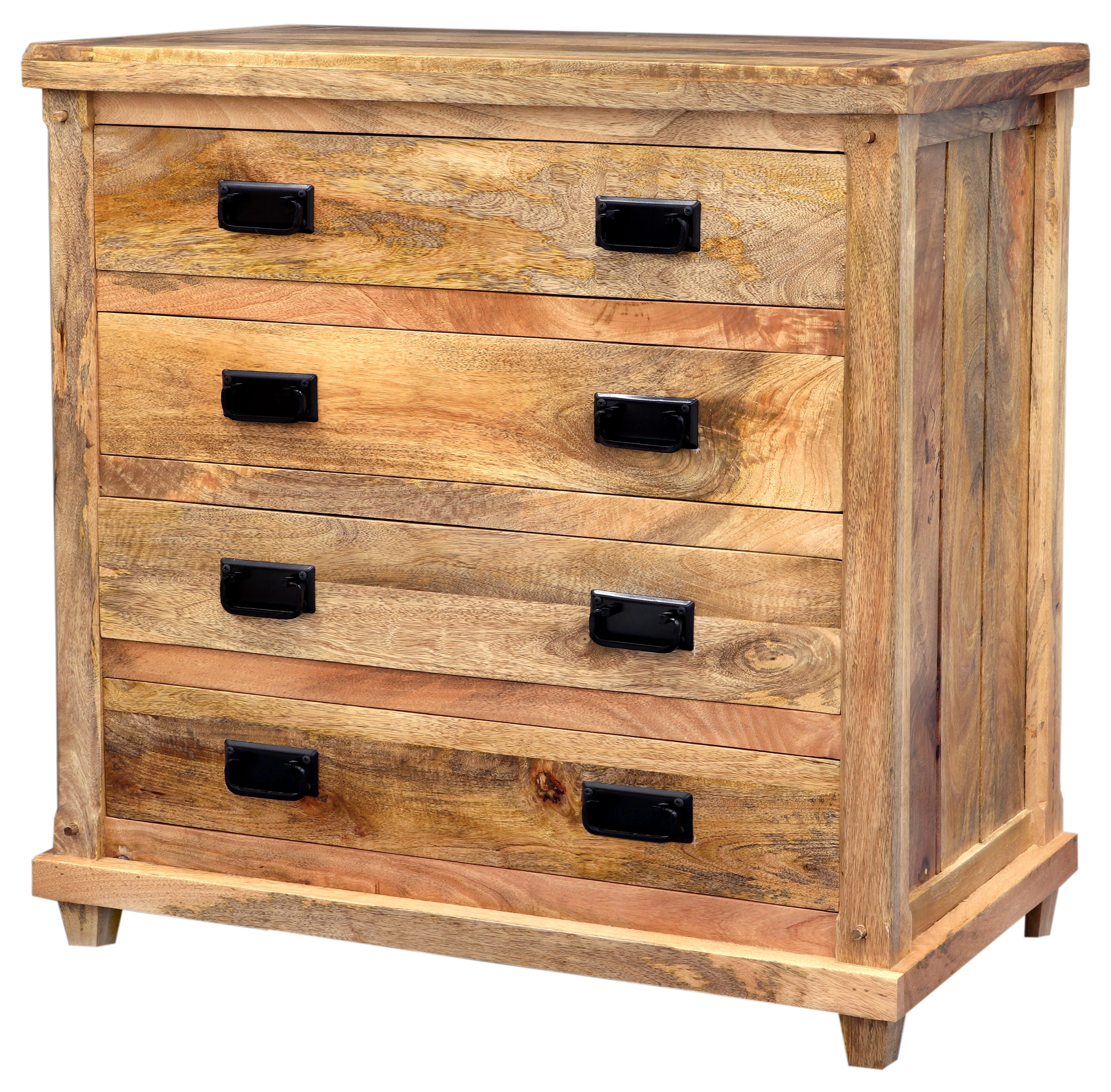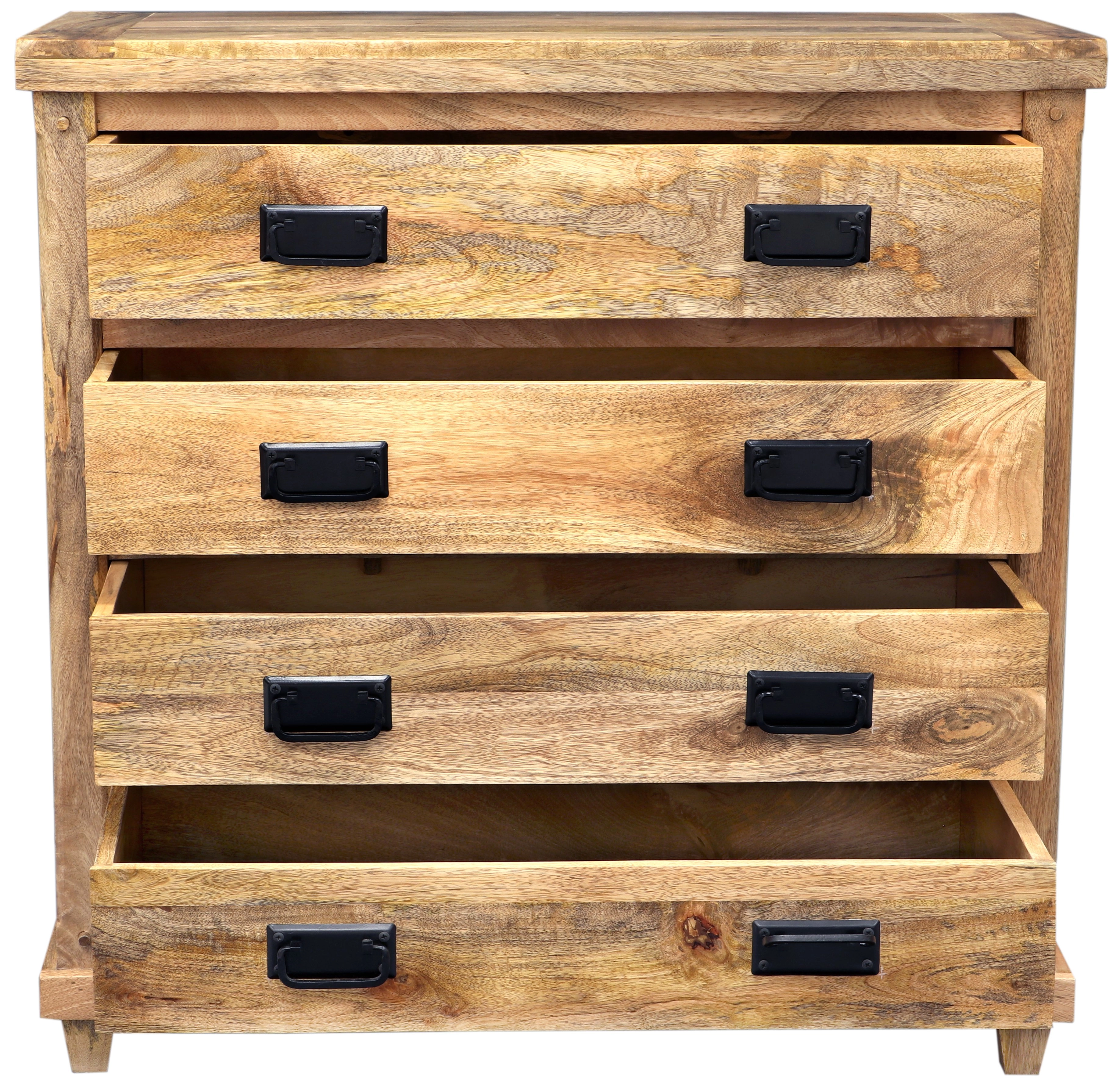 S rozměry 90 cm na šířku, 45 cm do hloubky a 90 cm na výšku, nabízí tato masivní komoda dostatečný úložný prostor díky čtyřem zásuvkám, které jsou vybaveny stylovými kovovými úchyty. Tato šuplíková komoda je ideální volbou pro vaši předsíň, ale skvěle se hodí i do ložnice nebo obývacího pokoje.