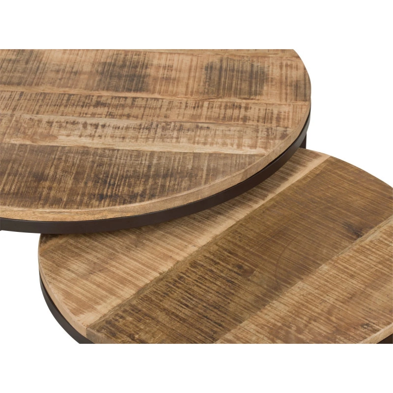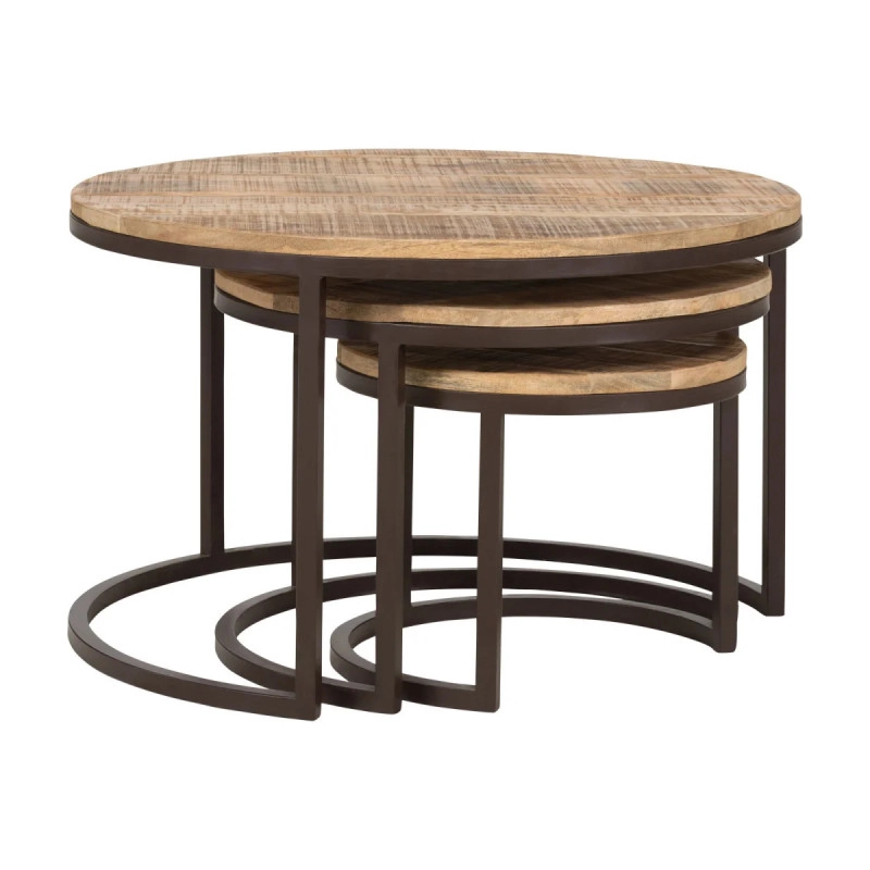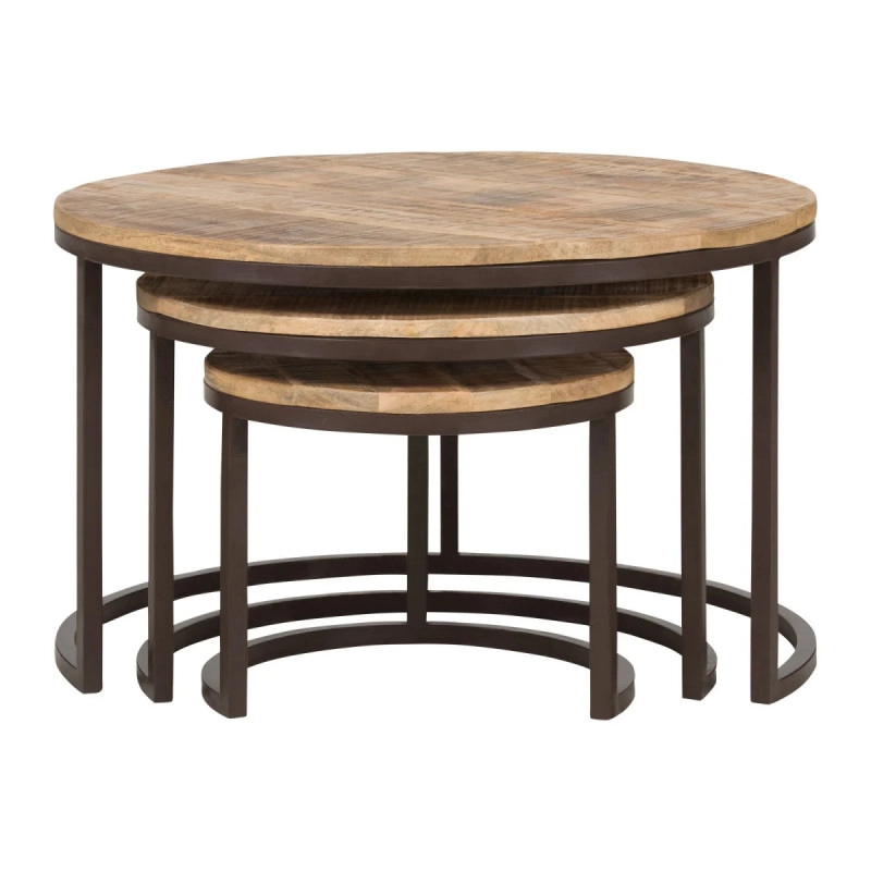 Sada 3 masivních konferenčních stolků Clairton z mangového dřeva je dokonalým doplňkem pro váš obývací pokoj. Jejich oválný tvar a přirozeně hnědá barva přinášejí do vašeho interiéru příjemný nádech elegance a útulnosti. Vyrobené z kvalitního mangového dřeva, které se vyznačuje nejen svou odolností, ale také jedinečnou texturou, tyto stolky se stávají nejen praktickým, ale i estetickým prvkem. Nezpracovaný povrch zdůrazňuje přirozenou krásu dřeva a činí každý stůl unikátním. Rozměry 75 cm x 75 cm x 47 cm poskytují dostatek prostoru pro vaše oblíbené nápoje, knihy nebo dekorace, přičemž zároveň zachovávají vzdušnost vašeho prostoru.