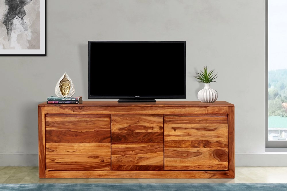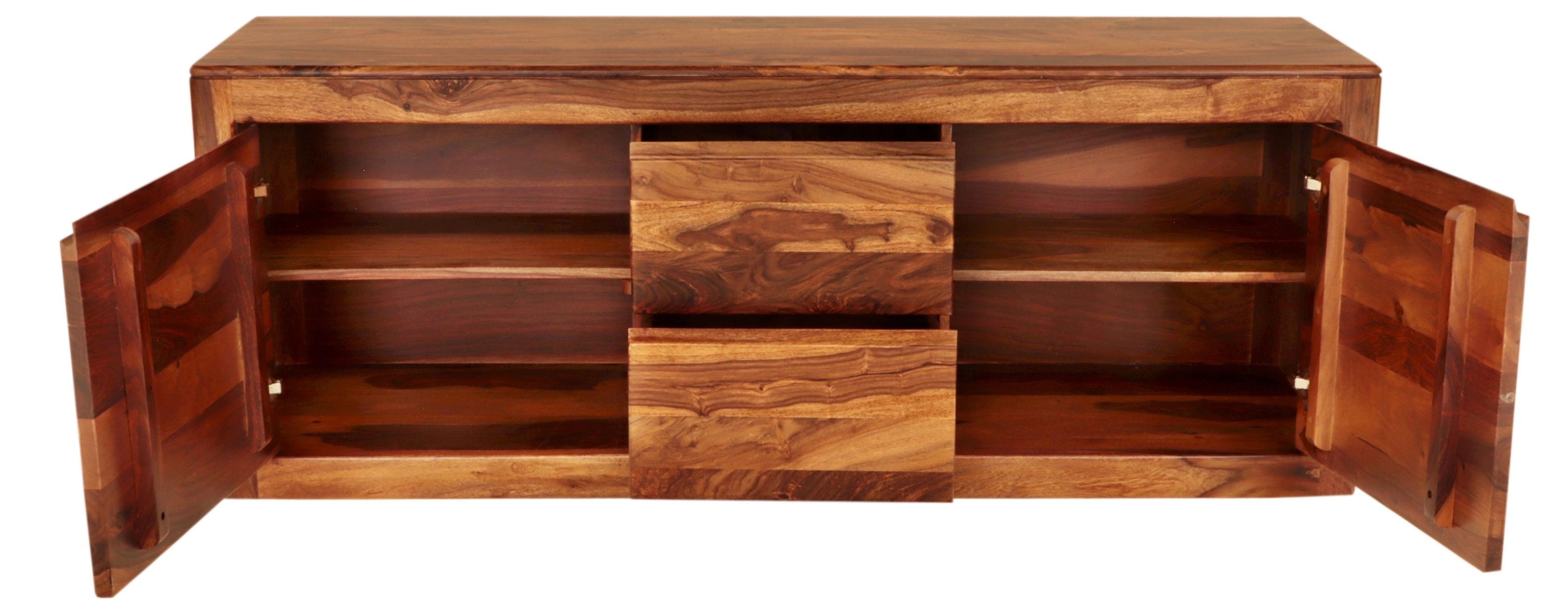 TV komoda masiv z palisandru disponuje dvěma skříňkami a dvěma prostornými šuplíky, což poskytuje dostatek úložného prostoru pro vaši elektroniku, kabely a další nezbytnosti. Její robustní konstrukce a precizní zpracování zaručují, že bude středobodem vaší obývací sestavy. Stylový design a přirozená kresba dřeva dodávají interiéru příjemnou atmosféru a přírodní nádech.