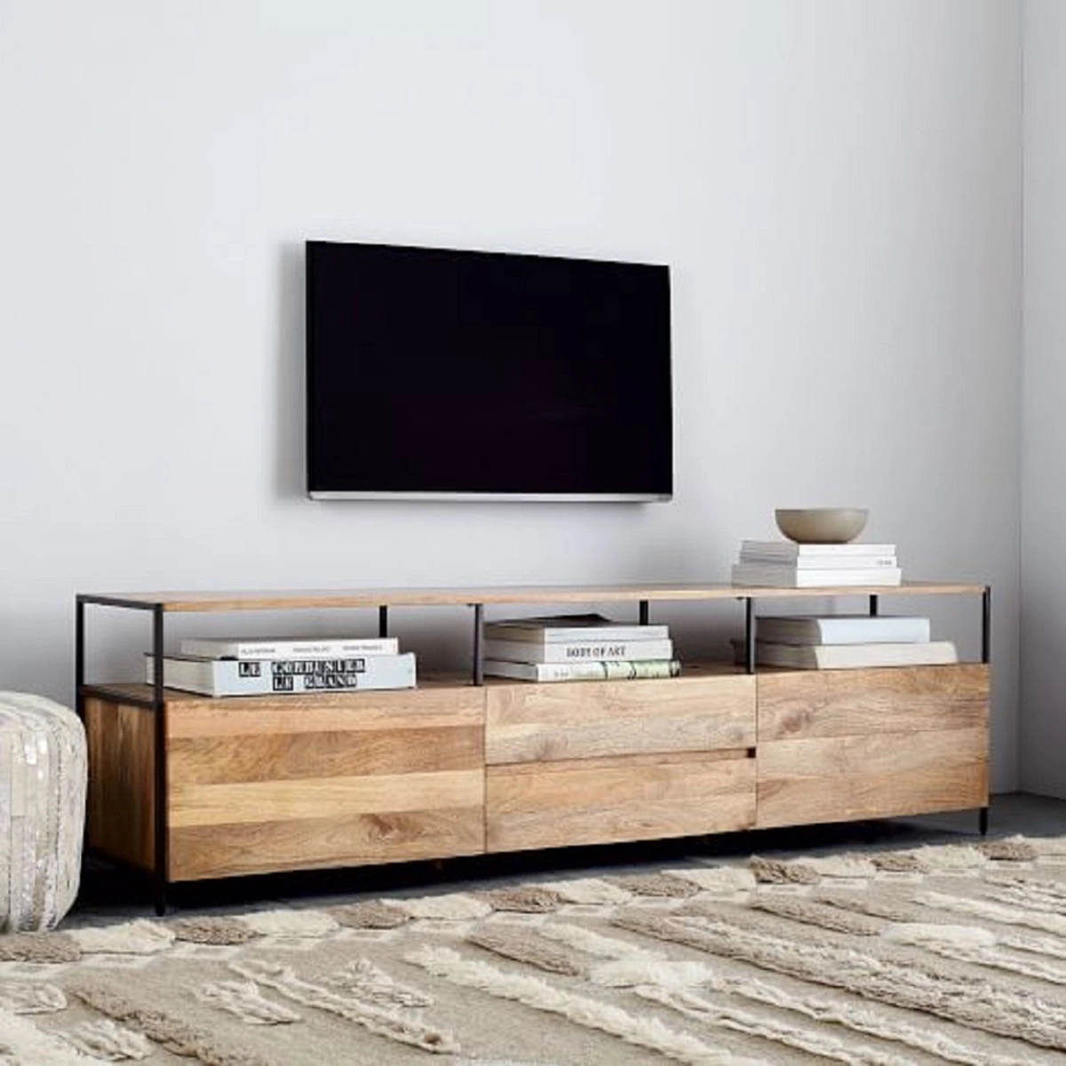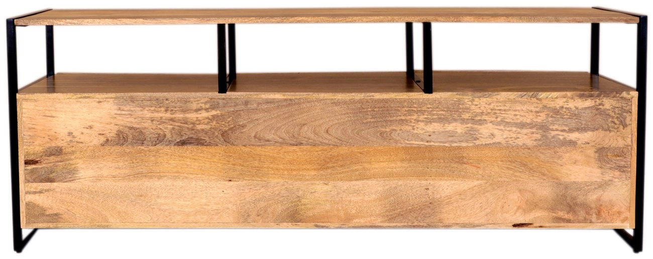Stolek je chytře rozdělen na čtyři části, které zahrnují dlouhou polici pro elektroniku a dekorační předměty, dvě skříňky o výšce 33 cm a šířce 50 cm pro skryté úložiště, a dva šuplíky o výšce 11,5 cm a šířce 46,5 cm pro uložení drobností. Tato kombinace zajišťuje, že vše potřebné bude mít své místo. Teplý odstín mangového dřeva a robustní kovová konstrukce tvoří harmonii, která přitáhne pohled každého návštěvníka.
