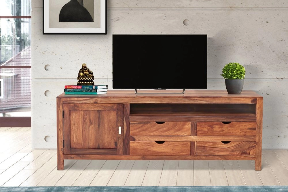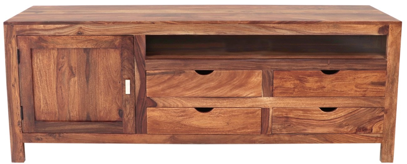 TV stolek z masivu nabízí nejen stylový vzhled, ale také praktické uspořádání. Je vybaven poličkou na elektroniku o šířce 109,5 cm a výšce 12,5 cm, která je ideální pro umístění herních konzolí, set-top boxů nebo DVD přehrávačů. Prostorné, čtyři šuplíky poskytují dostatek úložného místa, přičemž jejich vnitřní rozměry jsou 48,5 cm na šířku a 13,5 cm na výšku, zatímco vnější rozměry činí 52,5 cm na šířku a 15,5 cm na výšku. Kromě toho je stolek vybaven jednou skříňkou, kde můžete schovat další doplňky nebo příslušenství.