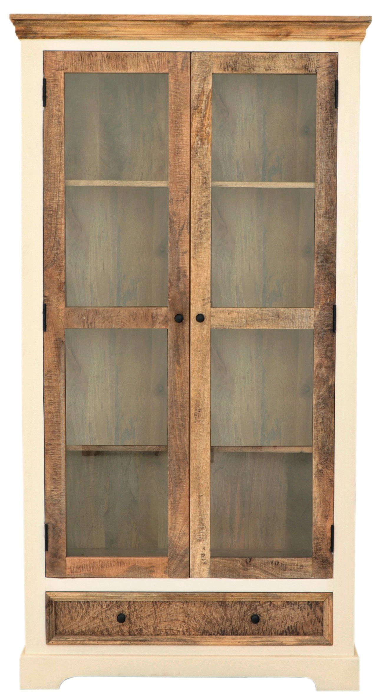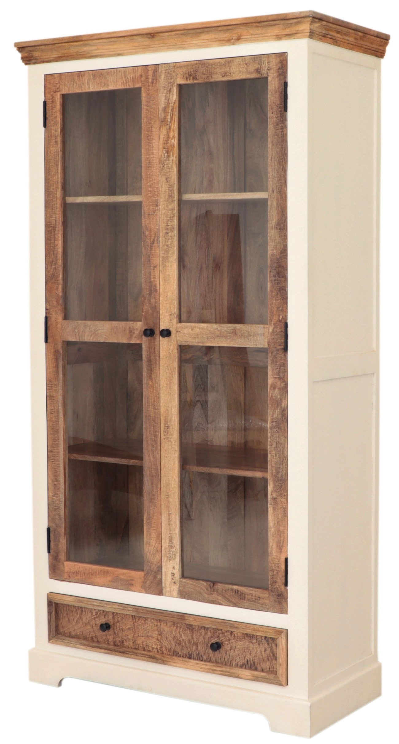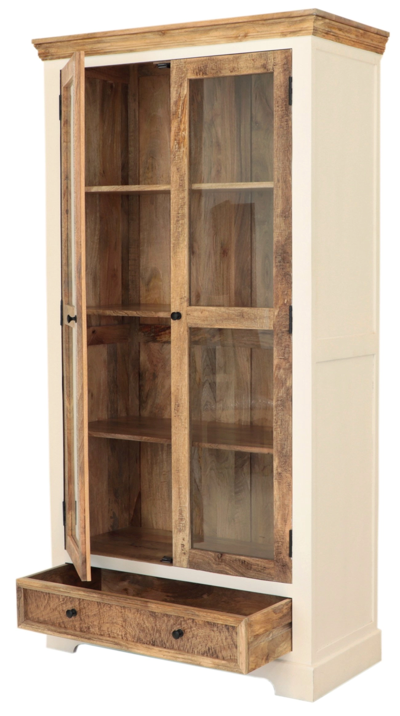 Vitríny z masivu se stávají centrálním bodem každého pokoje díky svému dechberoucímu vzhledu. Naše vitrína masiv z dřeva manga je vybavena prosklenými dveřmi, které umožňují nahlédnout na tři prostorné police. Tyto police jsou ideální pro vystavení oblíbených dekorativních předmětů, knih nebo suvenýrů z cest. Ve spodní části vitríny naleznete praktickou zásuvku, která poskytuje dodatečný úložný prostor pro drobnosti, které by mohly narušovat celkový vzhled vašeho interiéru.