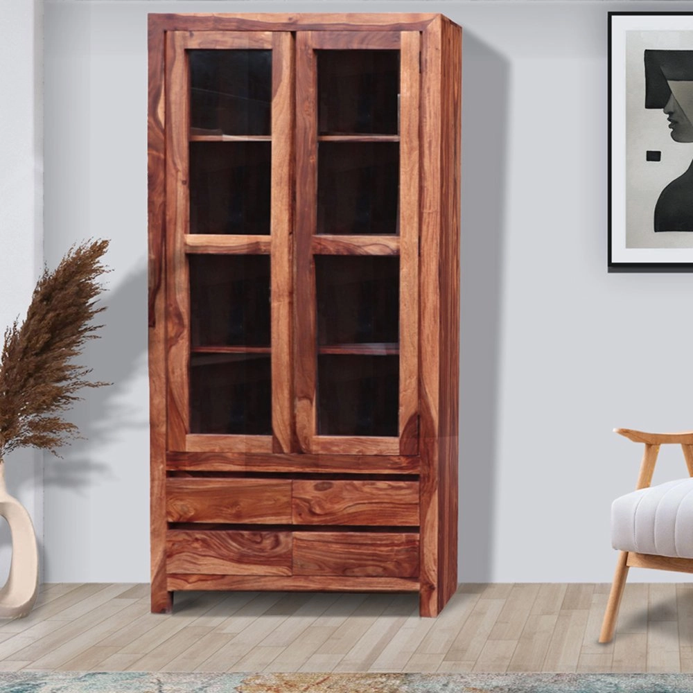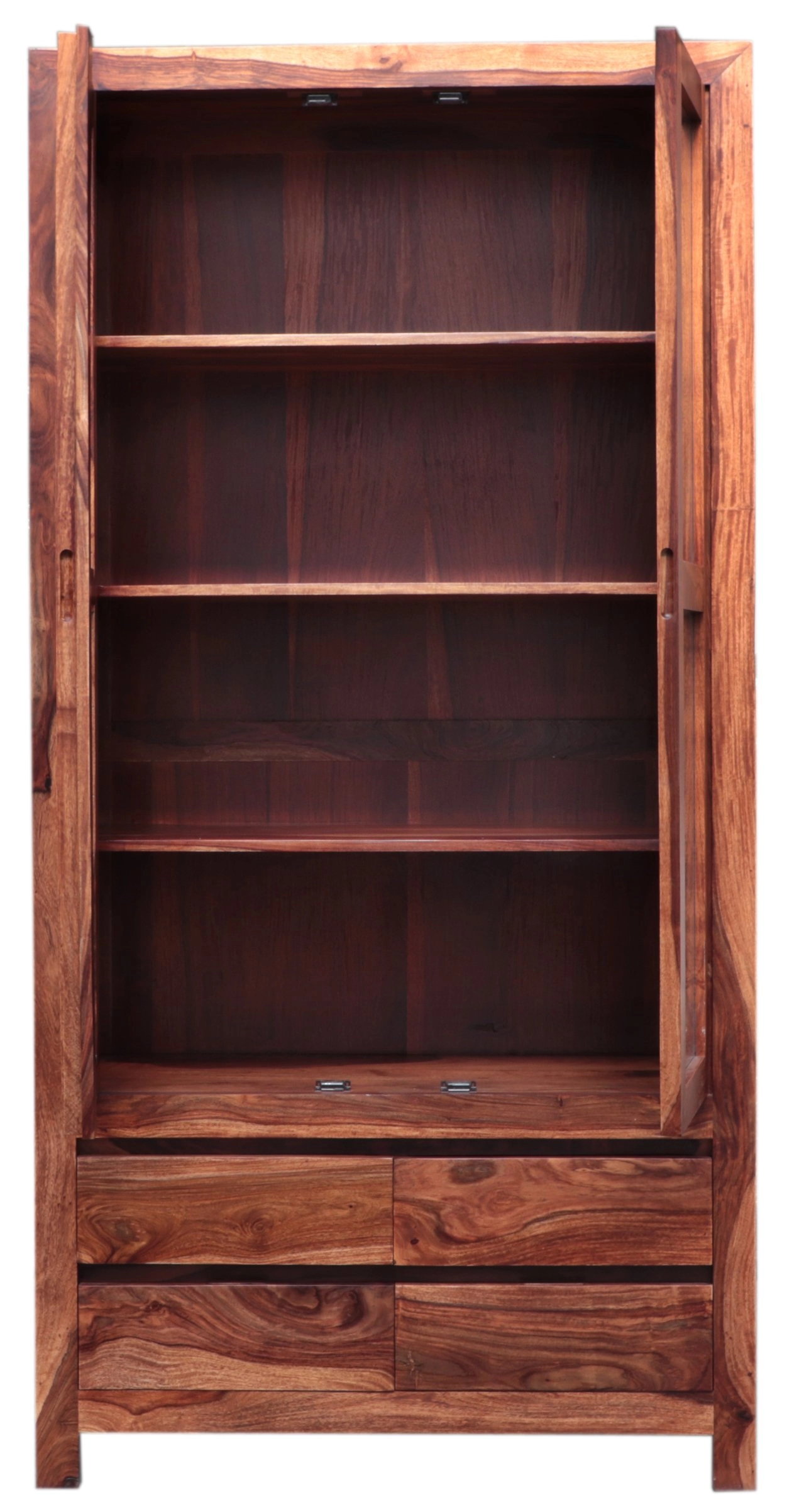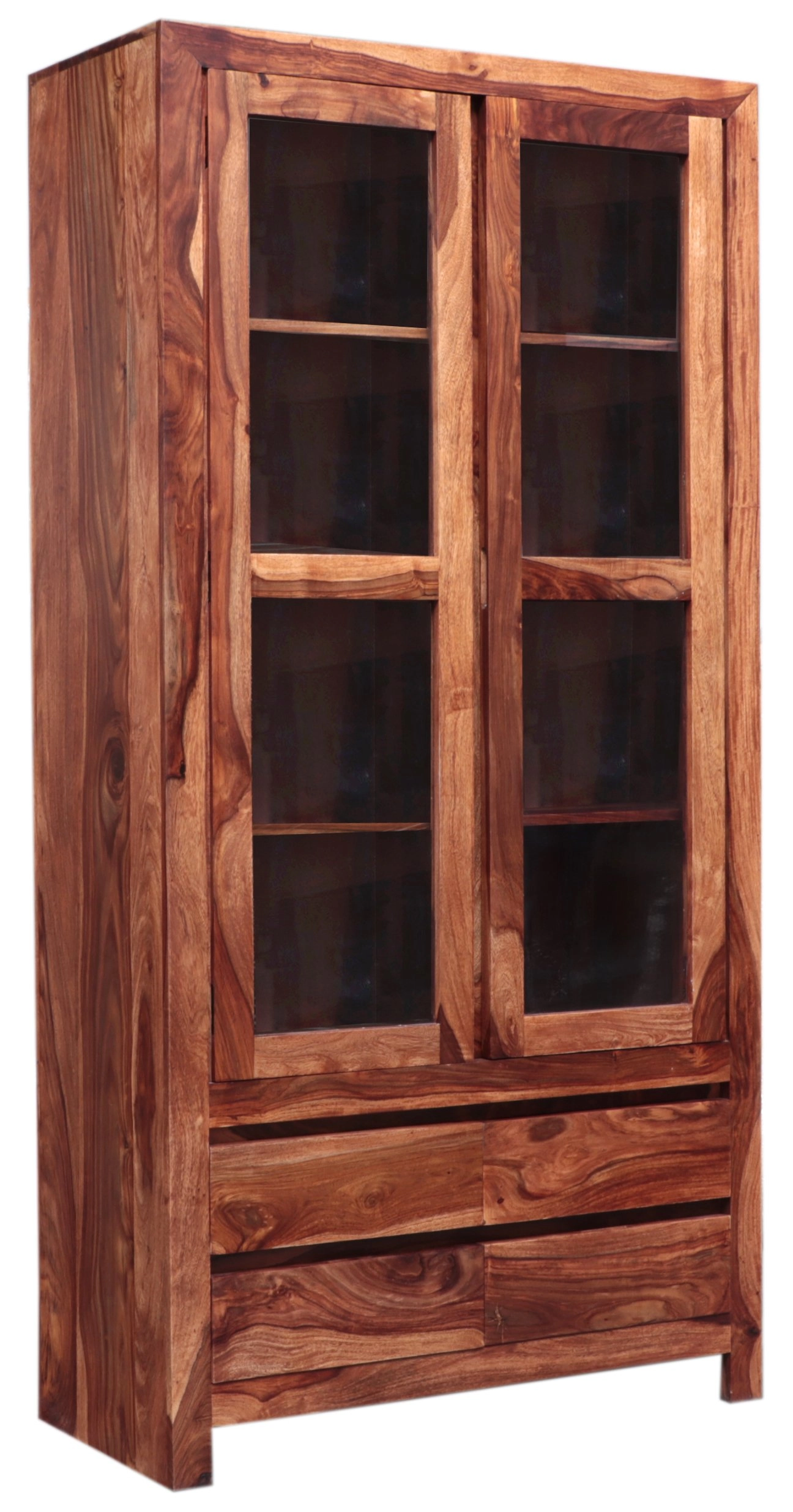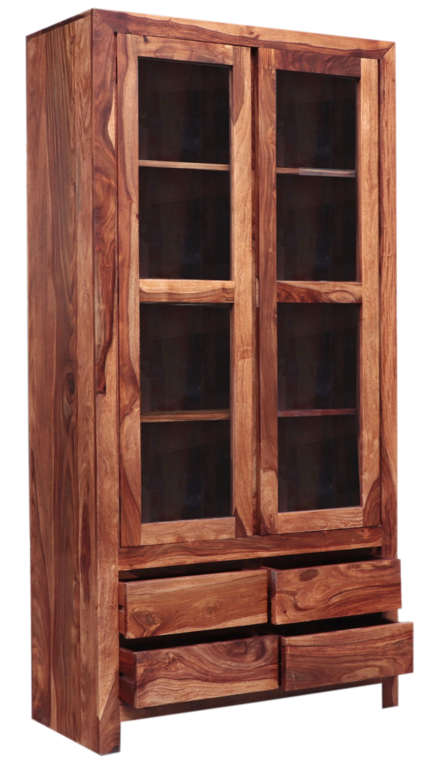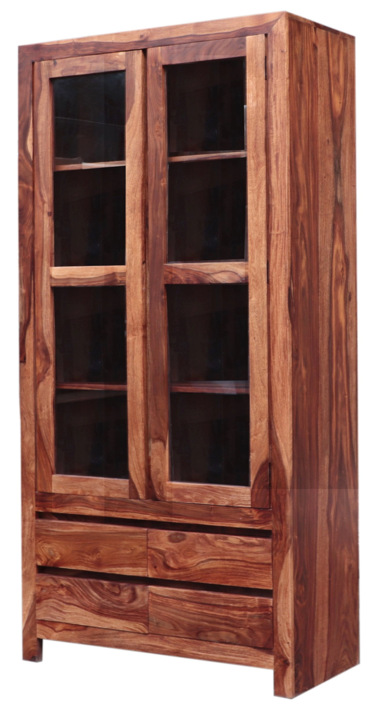 Vyrobena z kvalitního palisandru, známého svou pevností a výraznou kresbou dřeva, nabízí vitrína kombinaci estetické krásy a funkčního designu. Se čtyřmi šuplíky, třemi policemi a dvěma skříňkami s prosklenými dvířky poskytuje dostatek úložného prostoru pro vaše oblíbené knihy, dekorace nebo vzpomínkové předměty. Prosklená část zdůrazňuje eleganci vystavených předmětů, zatímco pevné dřevěné části zajišťují jejich ochranu.