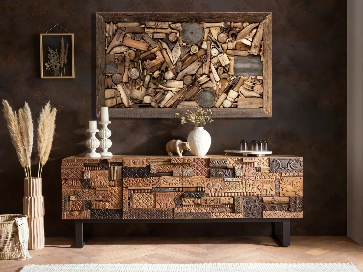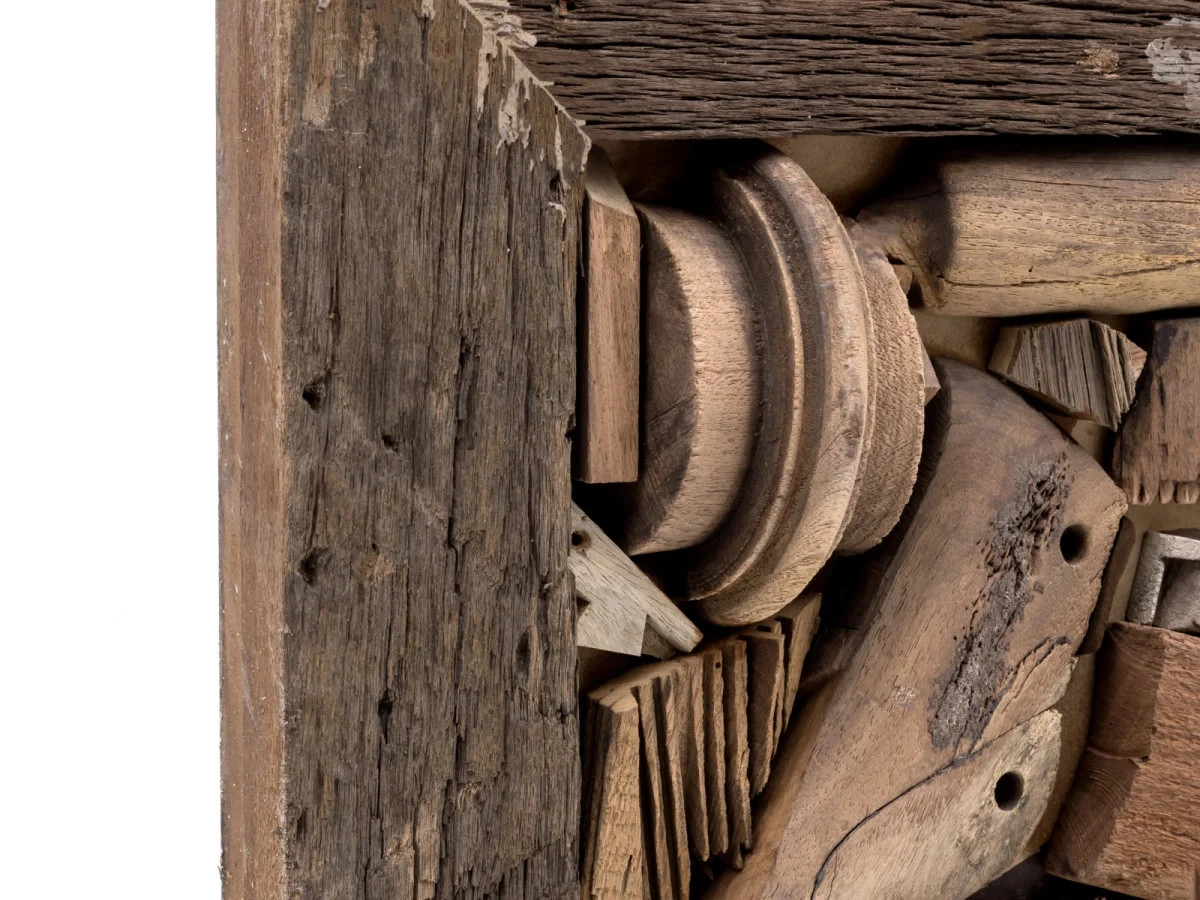 Entdecken Sie die Einzigartigkeit und die natürliche Schönheit des Wandgemäldes Kavali, hergestellt aus recyceltem Hartholz. Dieses handgefertigte Stück mit den Abmessungen 150×90 cm verleiht Ihrem Wohnzimmer einen warmen, rustikalen Charme dank seiner unverarbeiteten braunen Farbe und authentischen Textur.