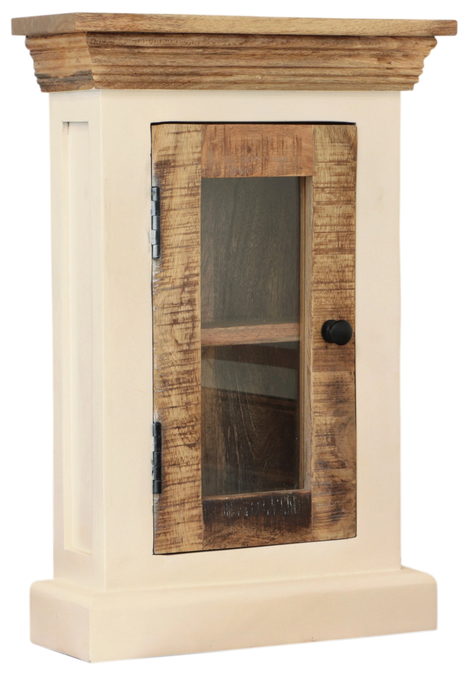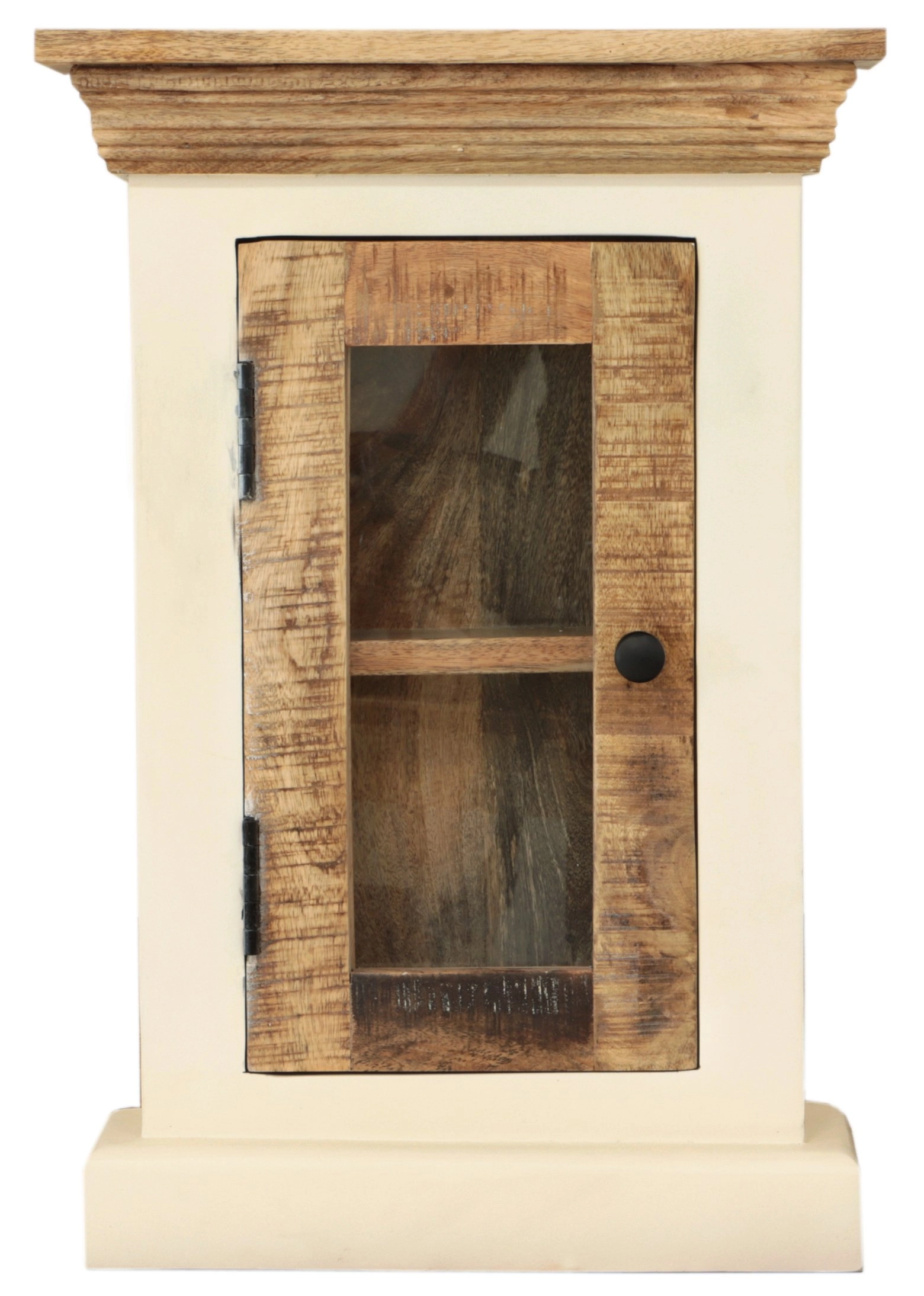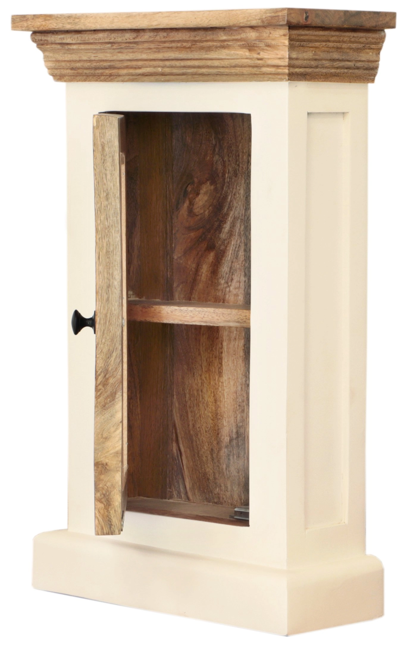 Tato nástěnná skříňka byla navržena v Indii a přináší autentický kus řemeslného umění s jemnými detaily a přírodní texturou dřeva. Mango jako materiál poskytuje pevnost a stabilitu, ale zároveň dodává každému kusu originální kresbu a odstín. Tento přírodní materiál je odolný vůči vlhkosti, což je pro koupelnový nábytek zásadní vlastnost.