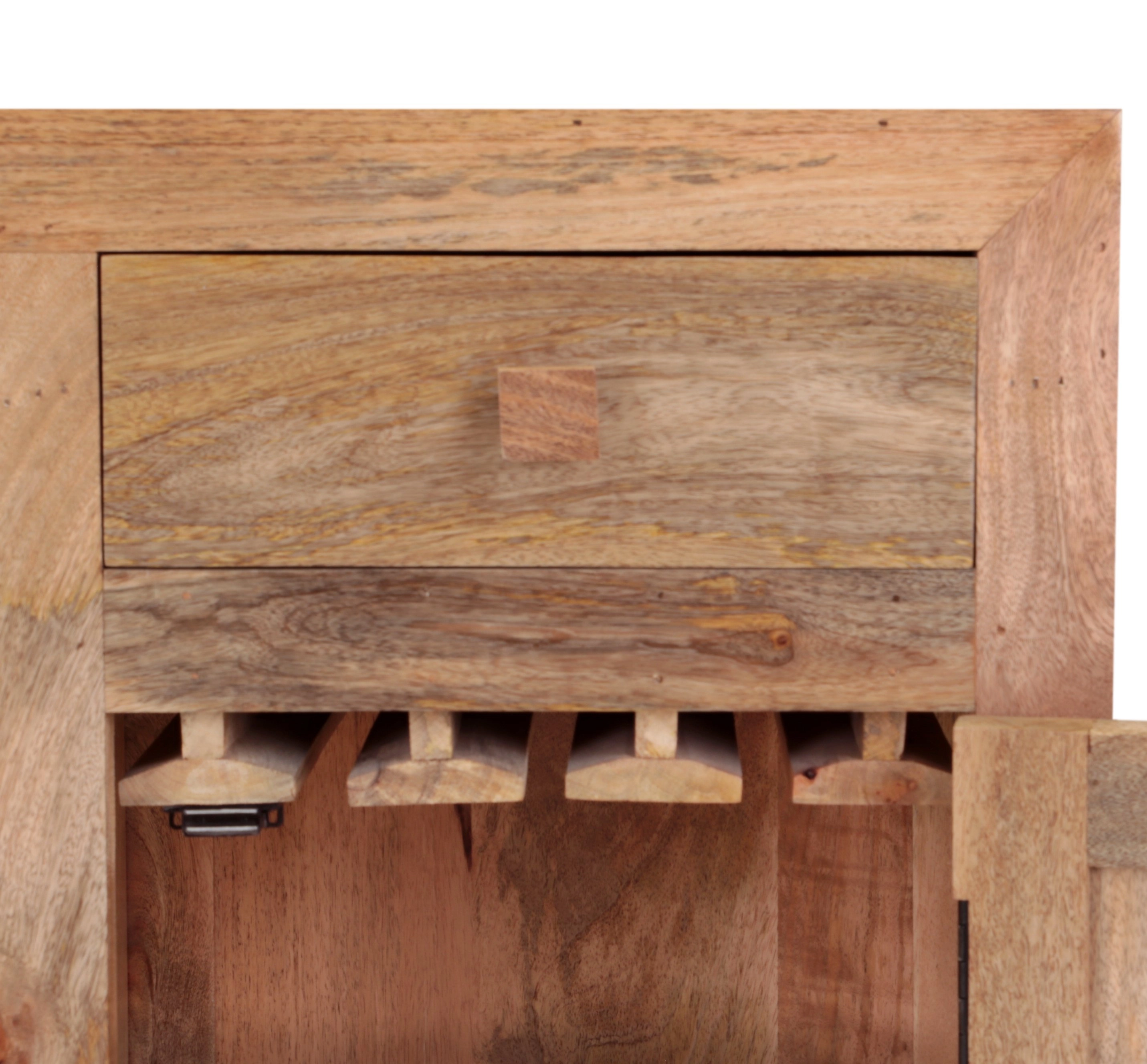 Vinotéka nabízí prakticky uspořádané prostory, které zahrnují dvířka pro diskrétní uložení lahví, zásuvku pro uskladnění dalších vinotékových potřeb a speciální prostory na lahve, které umožní vaše vína ukládat s elegancí. Tento stylový kus nábytku z Indie vyniká nejen svou funkčností, ale také exotickým designem, který přidá vaší kuchyni šmrnc a šarm.